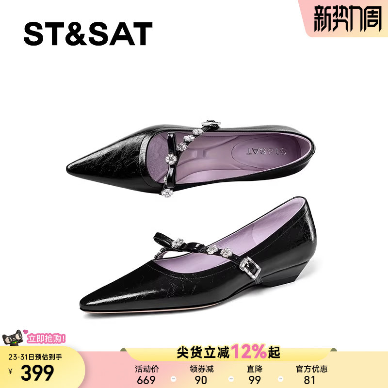 星期六2025春秋季尖头浅口单鞋女真皮水钻低跟法式玛丽珍气质女鞋