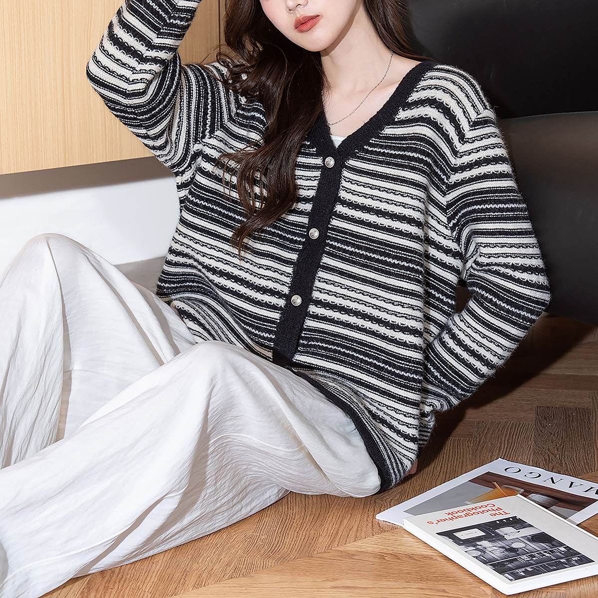 唐狮秋冬女毛衣设计感条纹V领针织开衫女春秋外套高级感时尚TD