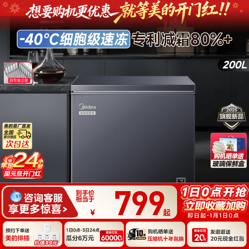 美的冰柜-40℃超低温100/142/200升冷冻冷藏家用小型冷柜一级冰箱