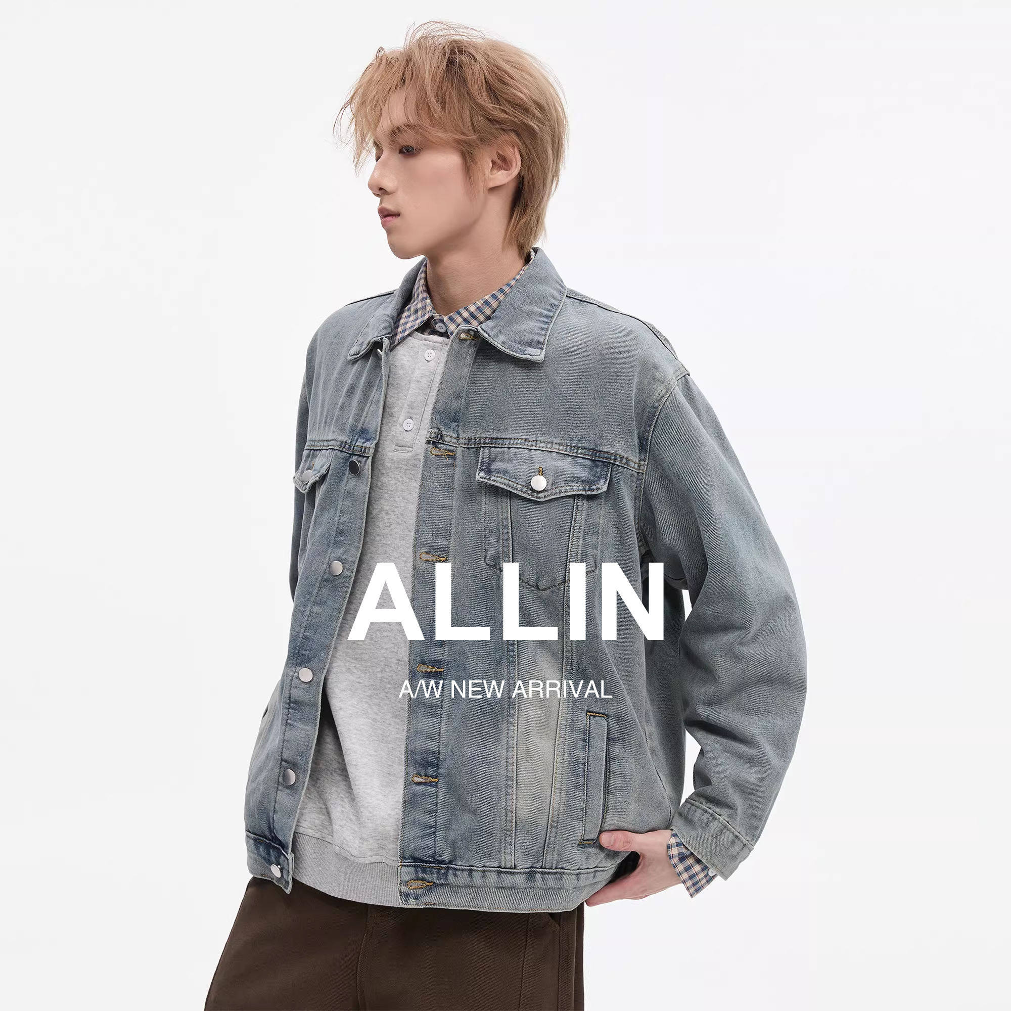 ALLIN 水洗牛仔外套男秋冬美式复古潮牌情侣cleanfit翻领休闲夹克