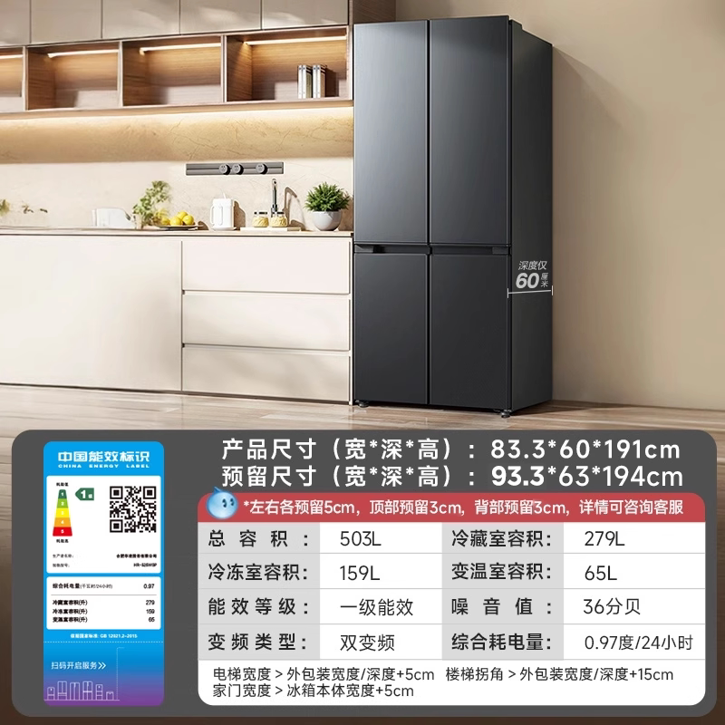 以旧换新补贴海尔539L十字双开四门一级能效无霜电冰箱家用大容量