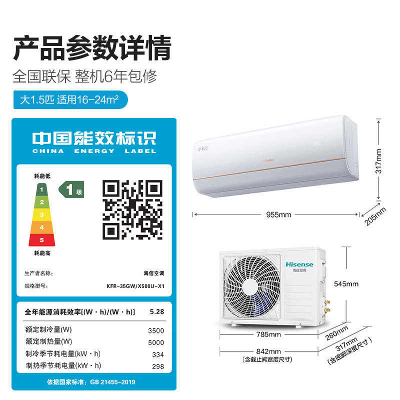 海信大1.5匹小氧吧X5增氧新风除醛净化一级能效变频挂机家用空调