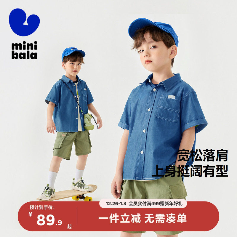 迷你巴拉巴拉男童衬衫儿童亲肤仿牛仔潮酷短袖上衣