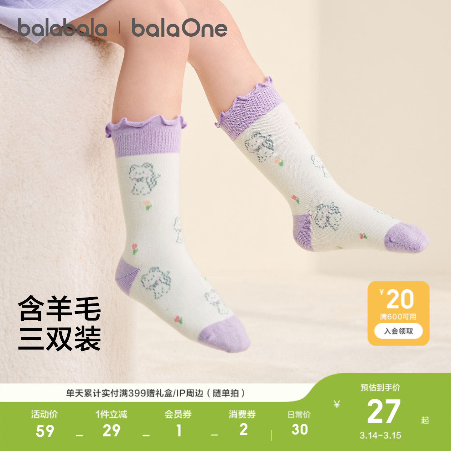 【balaOne】巴拉巴拉儿童袜子秋冬新女童袜子中大童含羊毛三双装