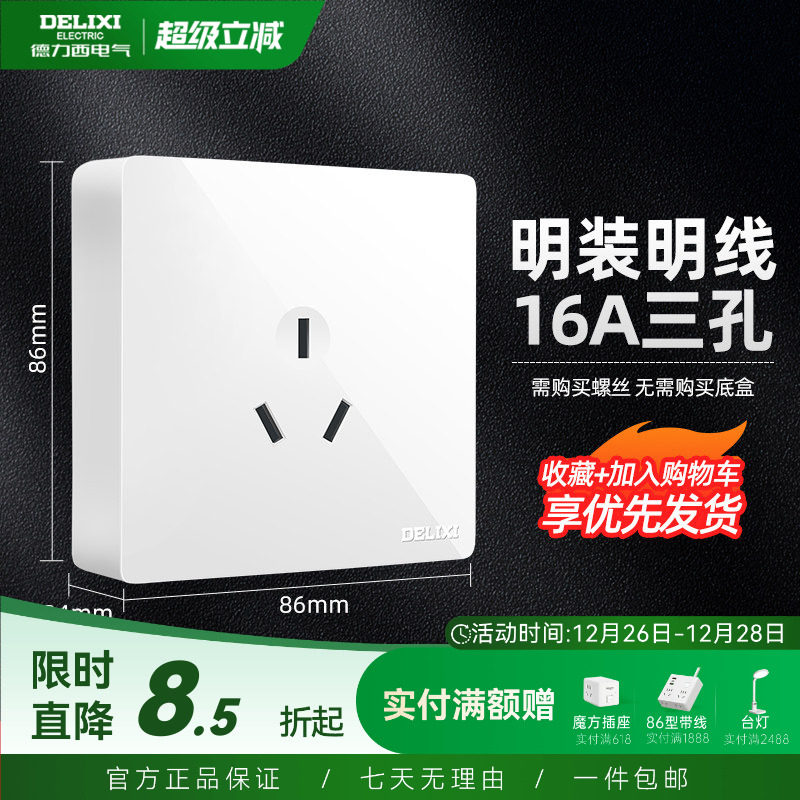 德力西开关插座明装三孔16A空调插座明线插座面板多孔墙壁插座