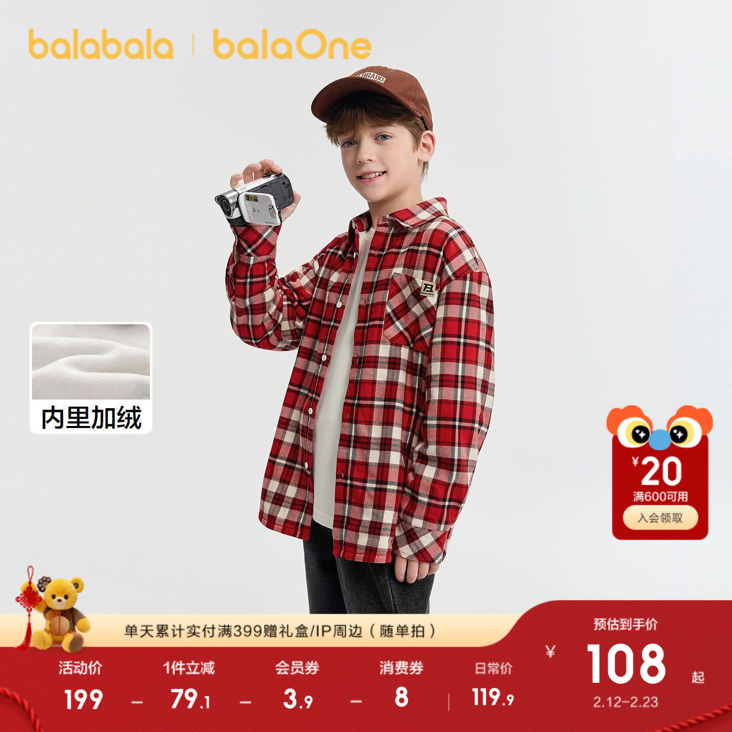 巴拉巴拉童装男童衬衫儿童上衣新款大童2025秋冬加绒保暖格子百搭