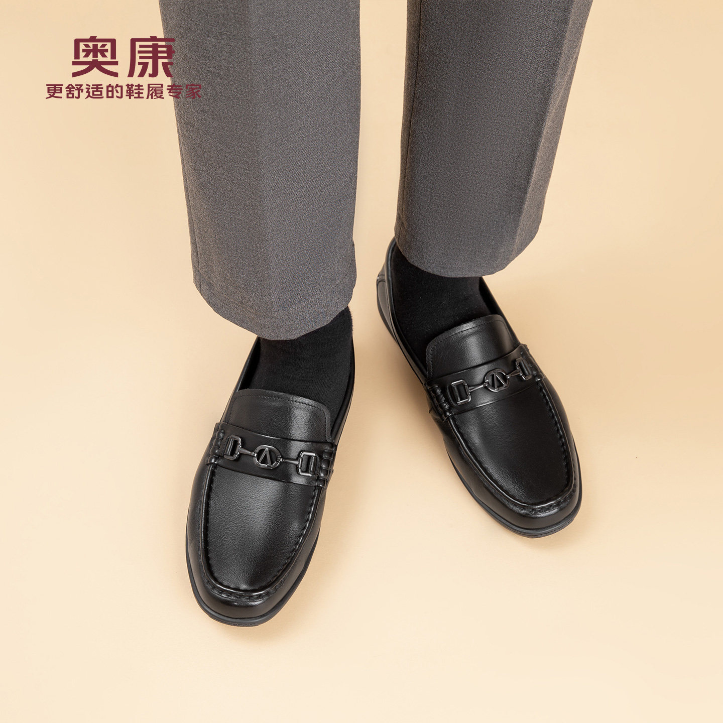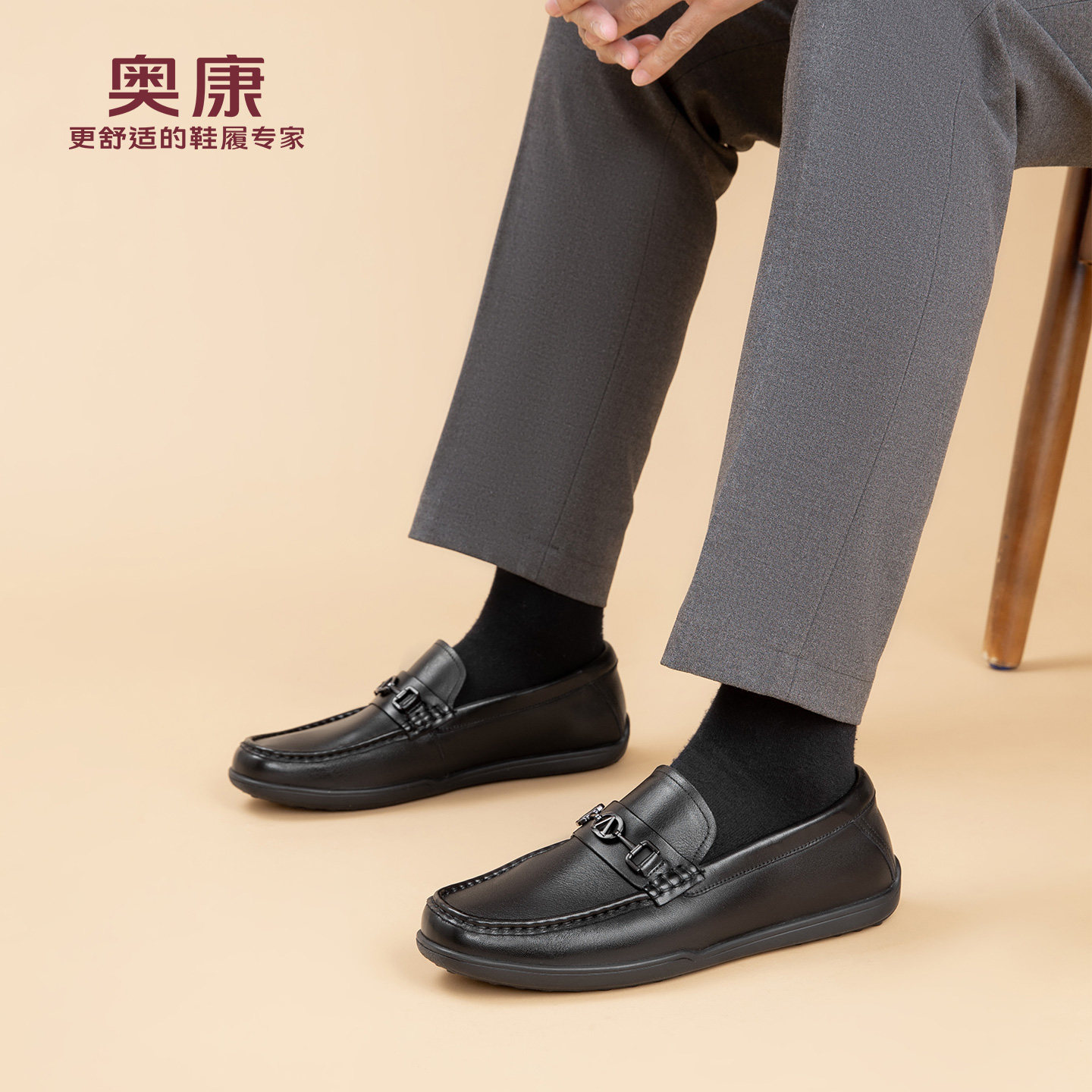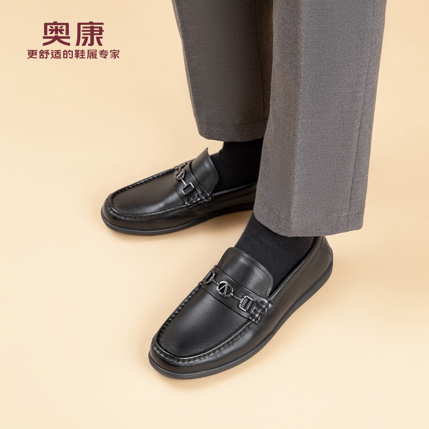 奥康春秋季商务休闲皮鞋男真皮软底乐福鞋舒适一脚蹬套脚爸爸鞋