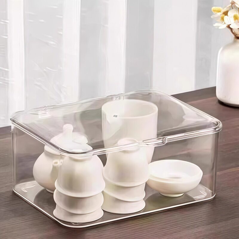 茶具收纳盒带盖防尘透明桌面茶杯功夫茶壶置物架长方形口罩大容量