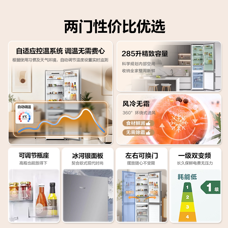 【预售】海尔冰箱285升上下两开门一级变频无霜小型家用官方正品