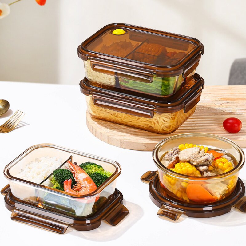 琥珀圆玻璃饭盒可微波炉加热带盖餐盒便当碗分隔保鲜盒多规格