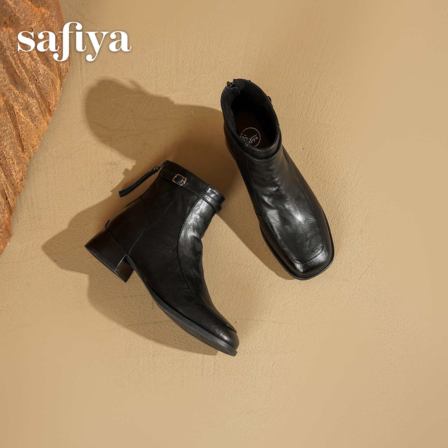 Safiya/索菲娅2025冬季新品英伦风粗跟方头加绒百搭皮鞋短靴女