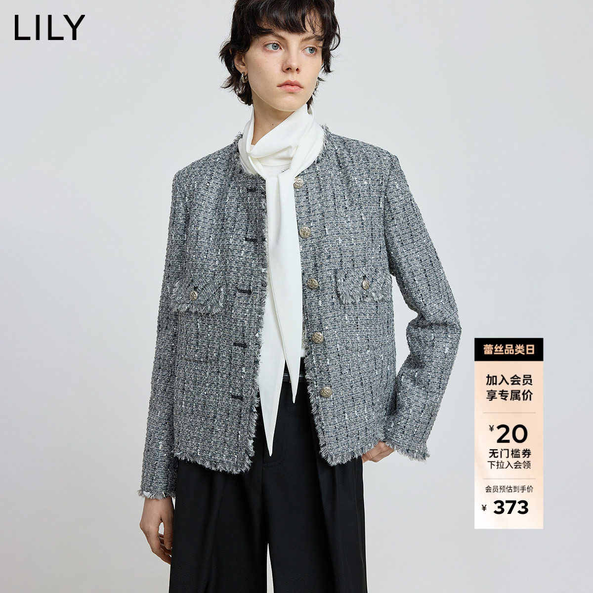 LILY2025冬新款含羊毛格雷系小香风粗花呢气质通勤灰色外套女短款