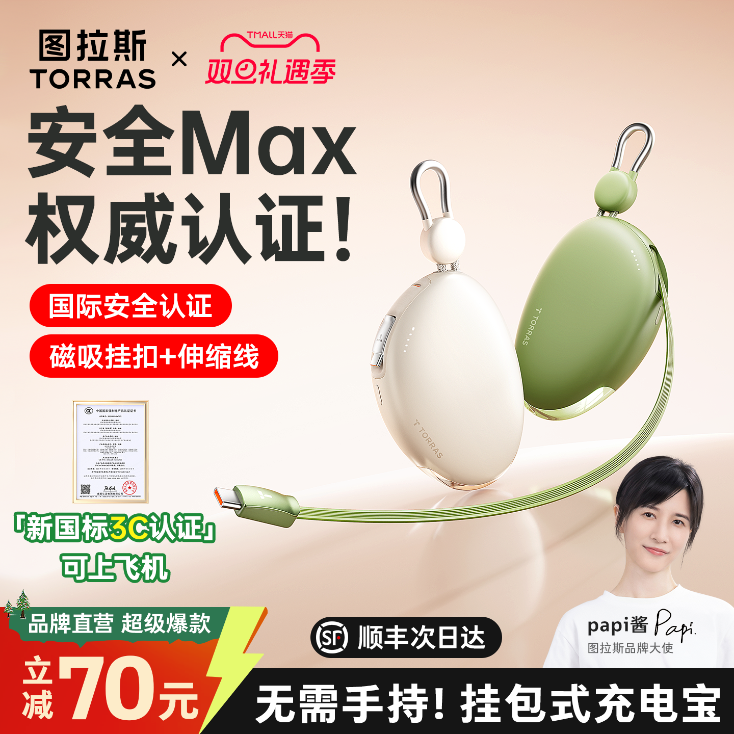 【papi酱同款】图拉斯Yoga鹅卵石挂包充电宝3C认证可上飞机2025新款快充适用苹果17伸缩线便携大容量移动电源