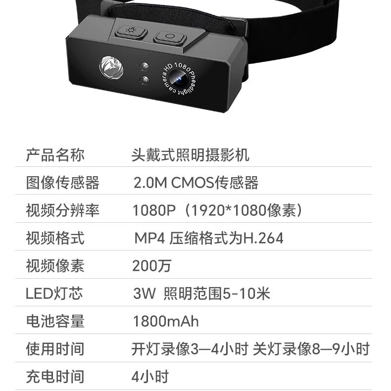 高清1080P头灯记录仪头戴式摄像机户外运动DV高清相机照明摄像头