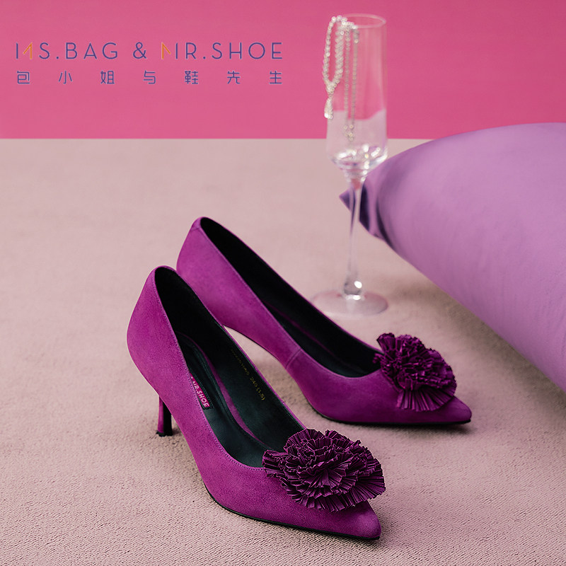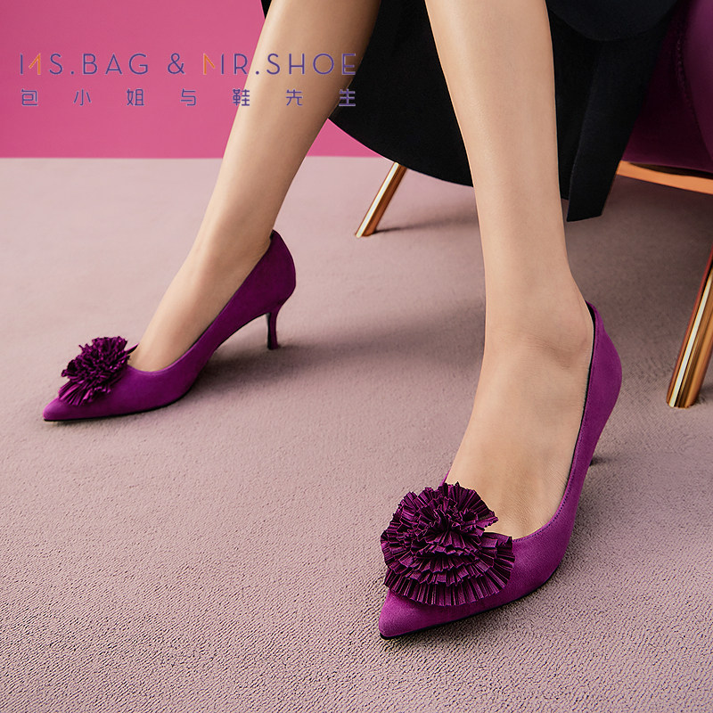 包小姐与鞋先生春季紫色百褶立体造花浅口单鞋女251065