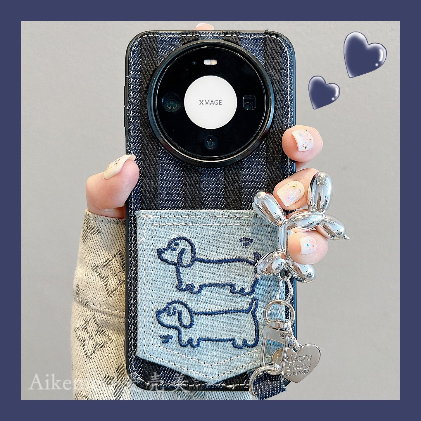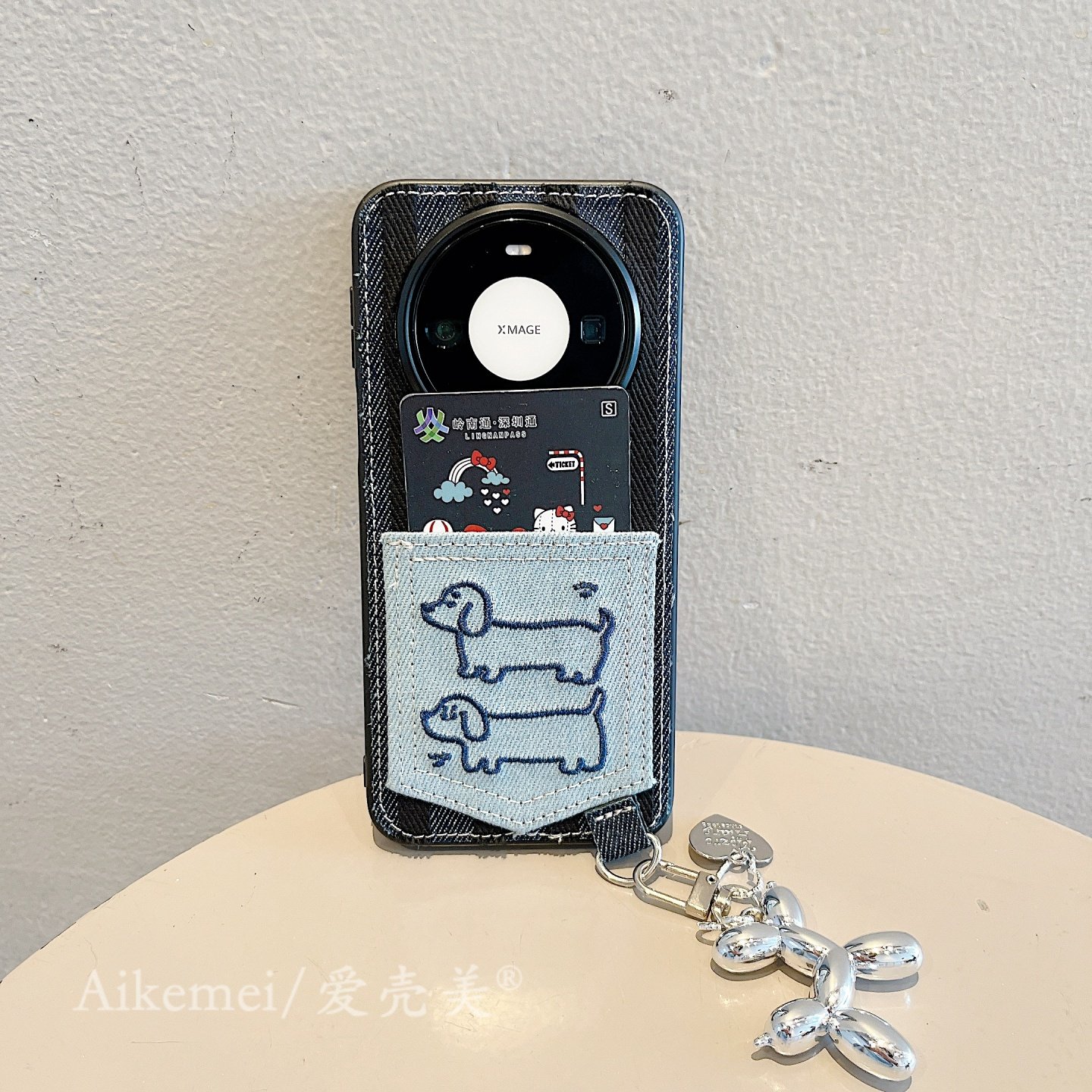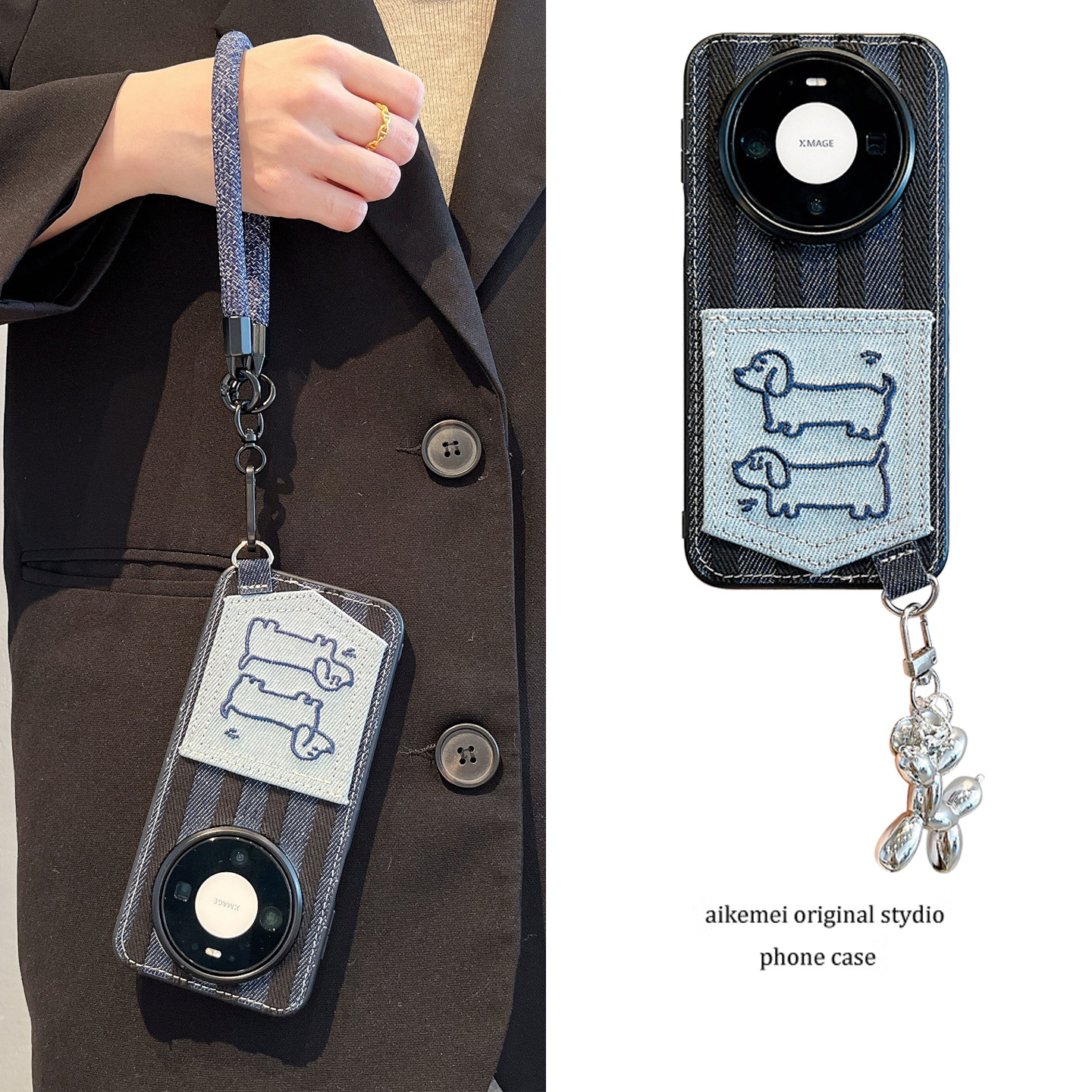 适用华为mate80promax手机壳韩系牛仔条纹线条腊肠狗卡包Mate70pro腕带挂绳mate60保护套pura80pro防摔男女款
