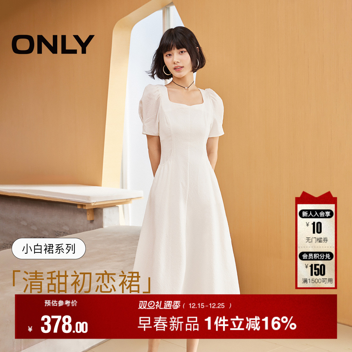 ONLY2026春季新款气质优雅方领泡泡袖收腰A字裙中长裙白色连衣裙