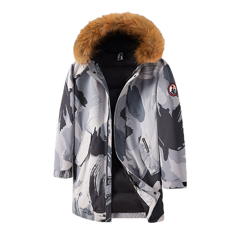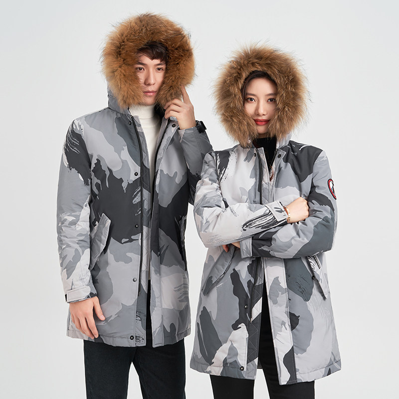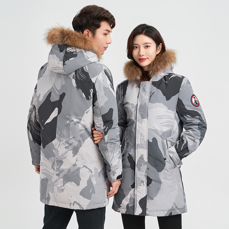 品牌同款冬季男女新款登山系列防风御寒迷彩带毛连帽中长款羽绒服