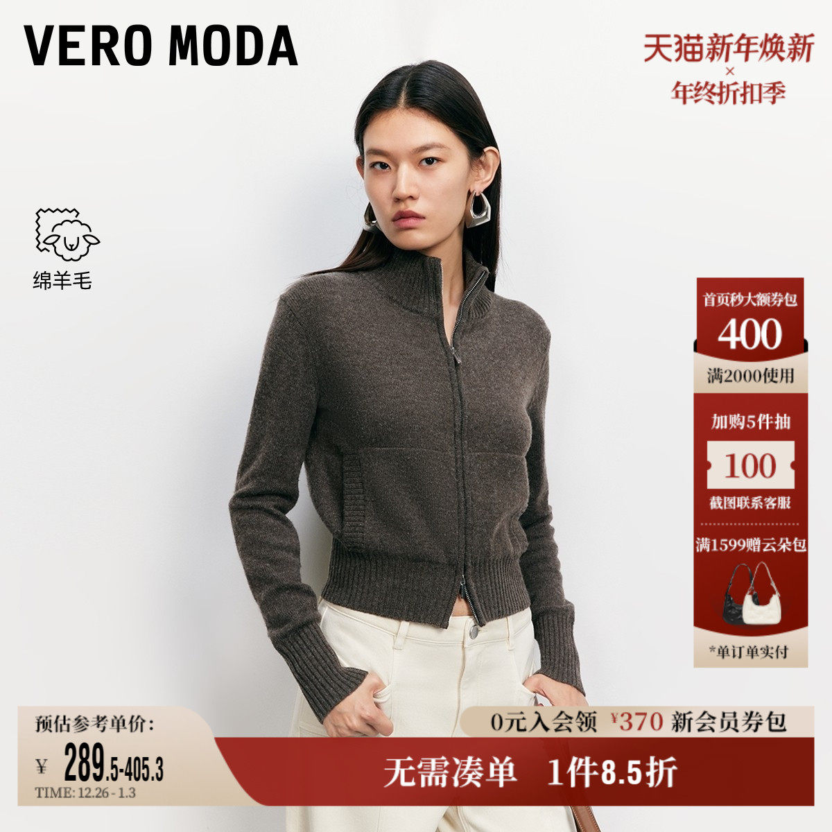Vero Moda奥莱毛衣女2025秋冬新款含绵羊毛双拉链高领开衫慵懒
