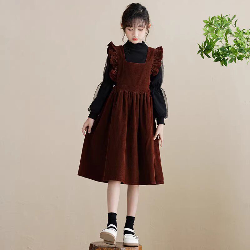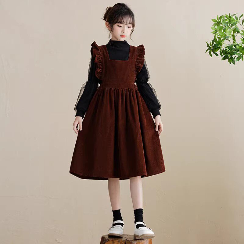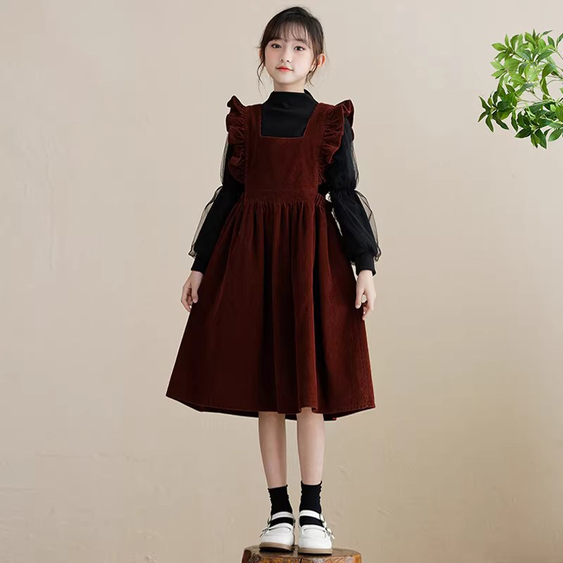 女童连衣裙秋冬赫本风小黑裙女孩学院背带裙套装新年战袍红色裙子
