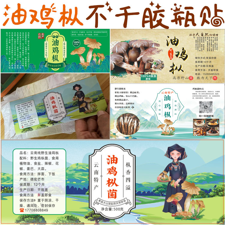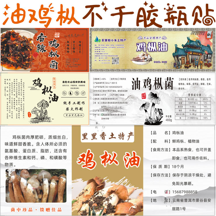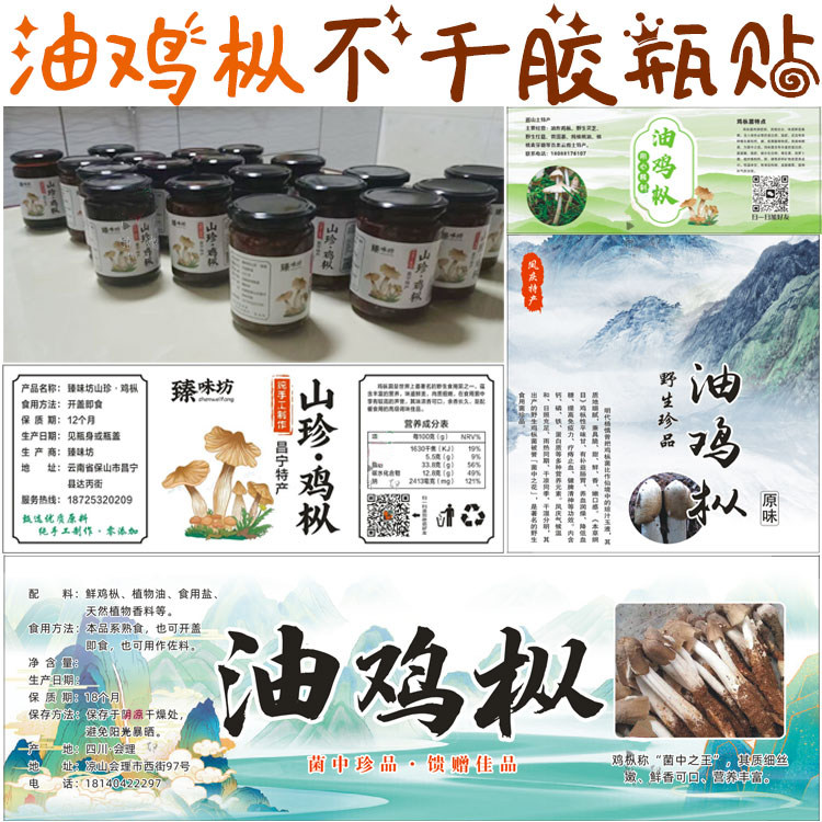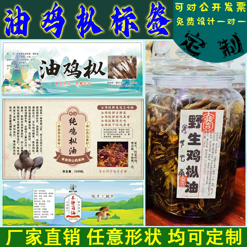 定制鸡枞菌瓶子罐子贴纸油鸡枞不干胶标签松茸菌包装贴纸羊肚菌牛肝菌松茸油商标设计印刷野生菌菇酱包装设计