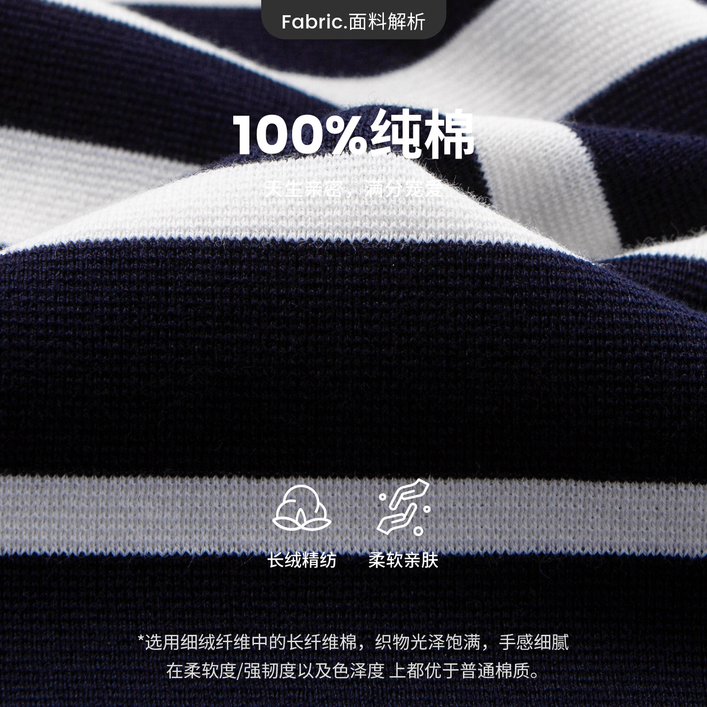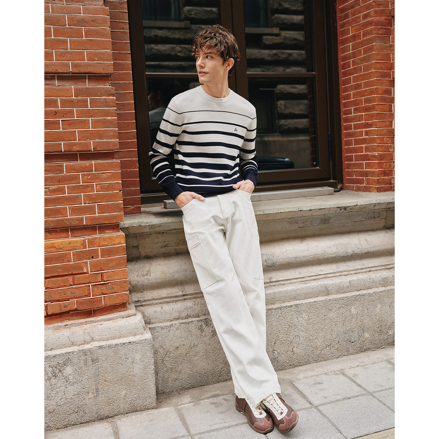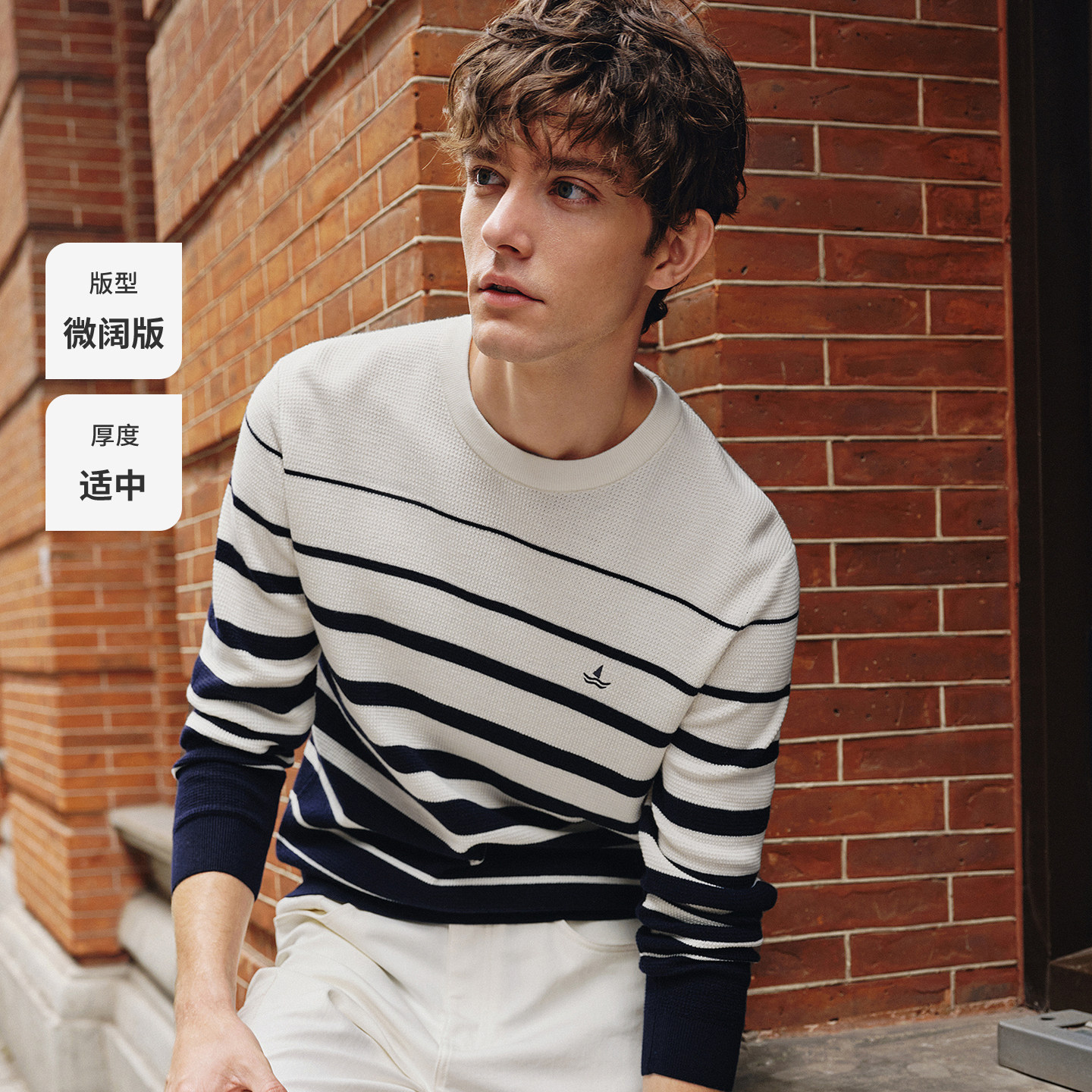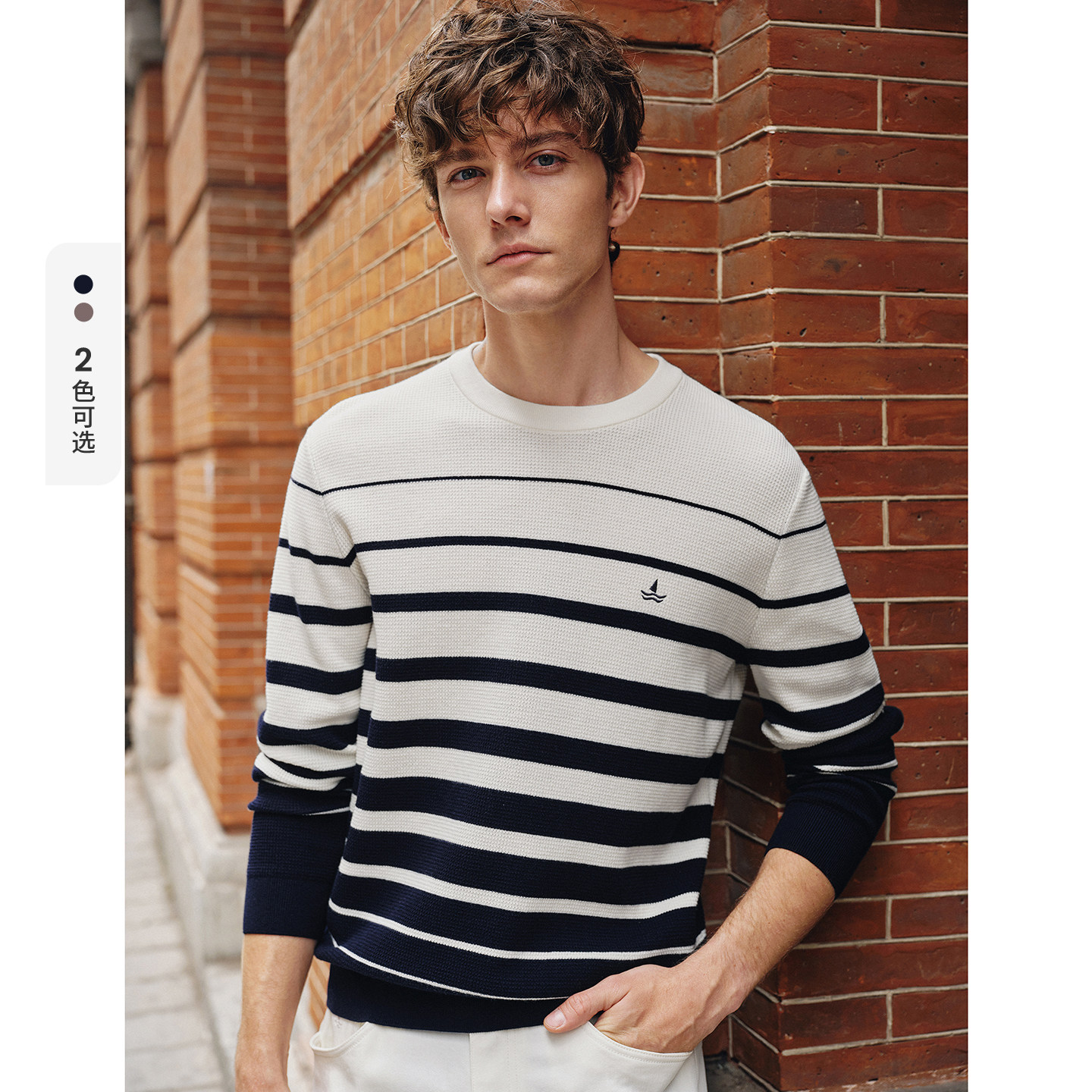 Navigare意大利小帆船纯棉条纹针织衫男士春秋季新款通勤圆领毛衣