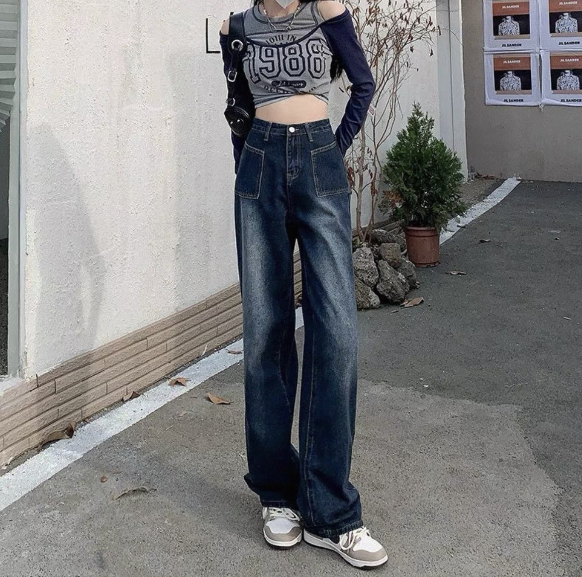 艾恩晟 2025早春美式宽松垂感牛仔阔腿裤深蓝色系慵懒风ins博主风
