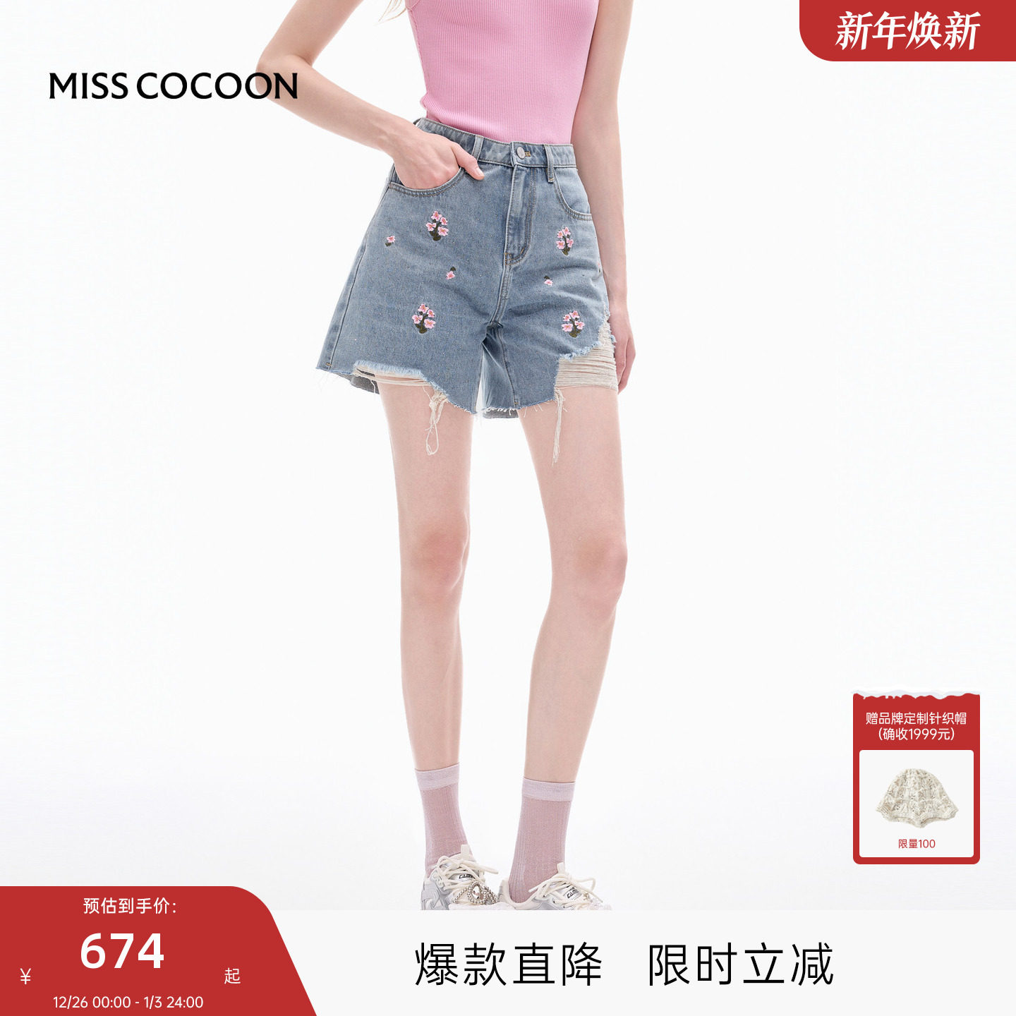 MISSCOCOON可可尼刺绣牛仔短裤女2025秋季新款破洞休闲薄款热裤