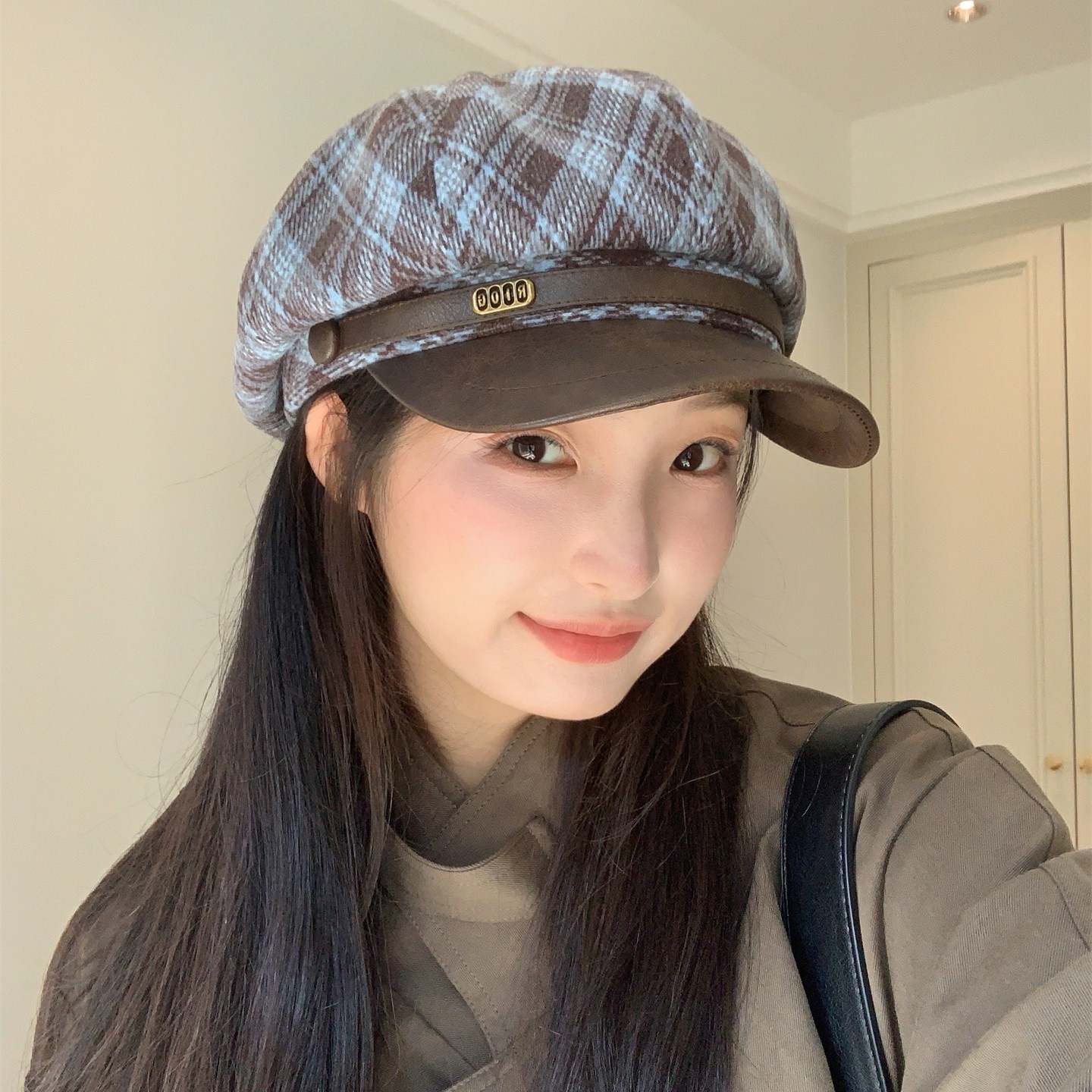 显脸小英伦风格纹毛呢八角帽黑复古反戴贝雷帽女报童帽子红色黑色