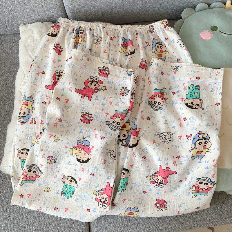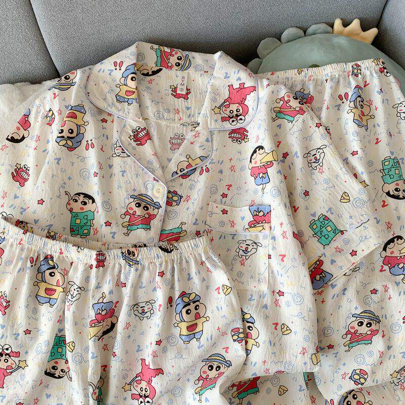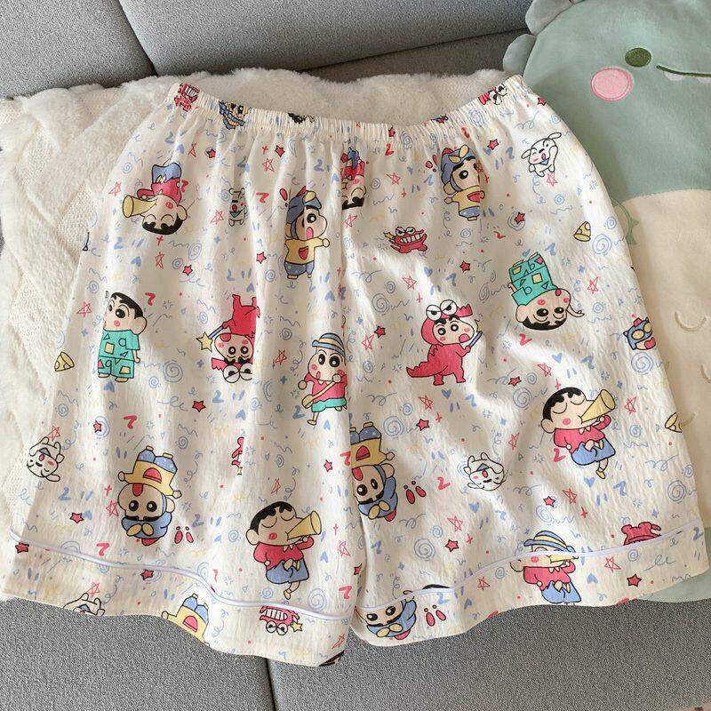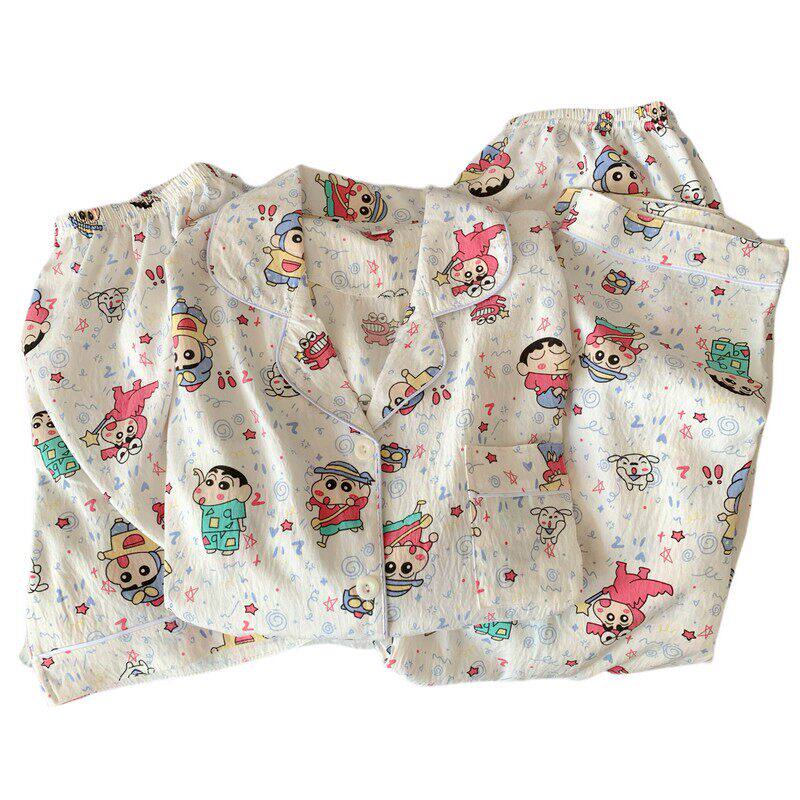 红豆卡通彩色蜡笔小新大码睡衣女春夏季短袖云朵纯棉可爱少女三件