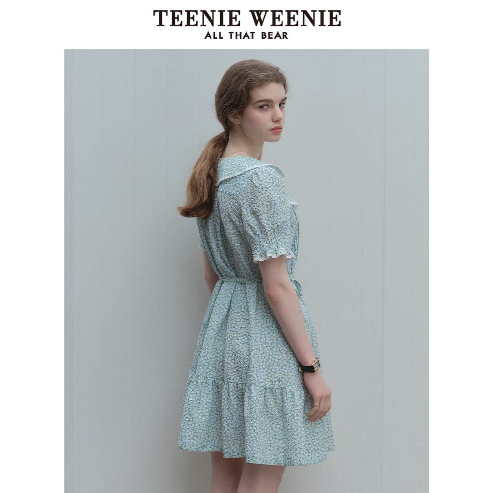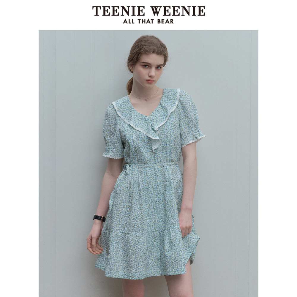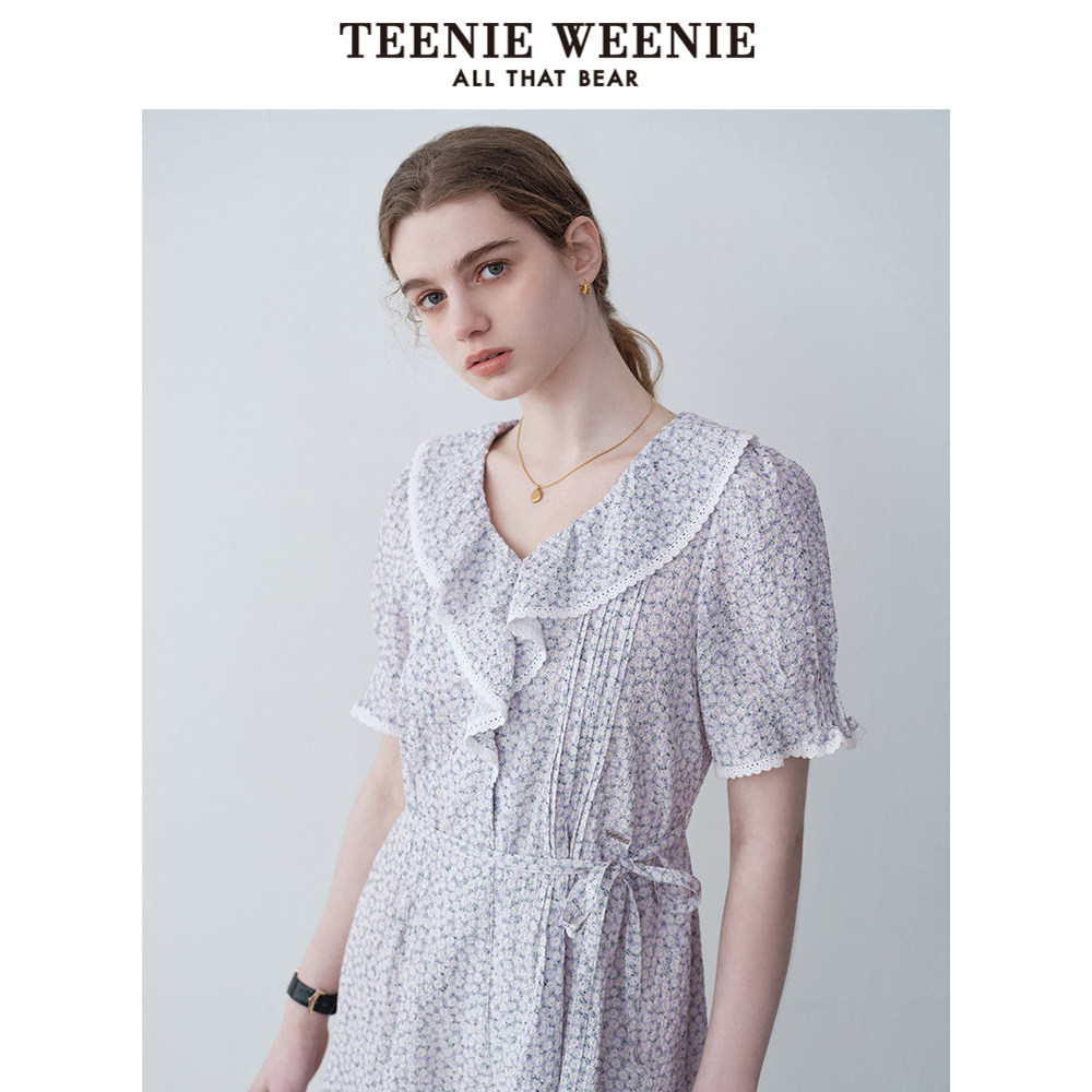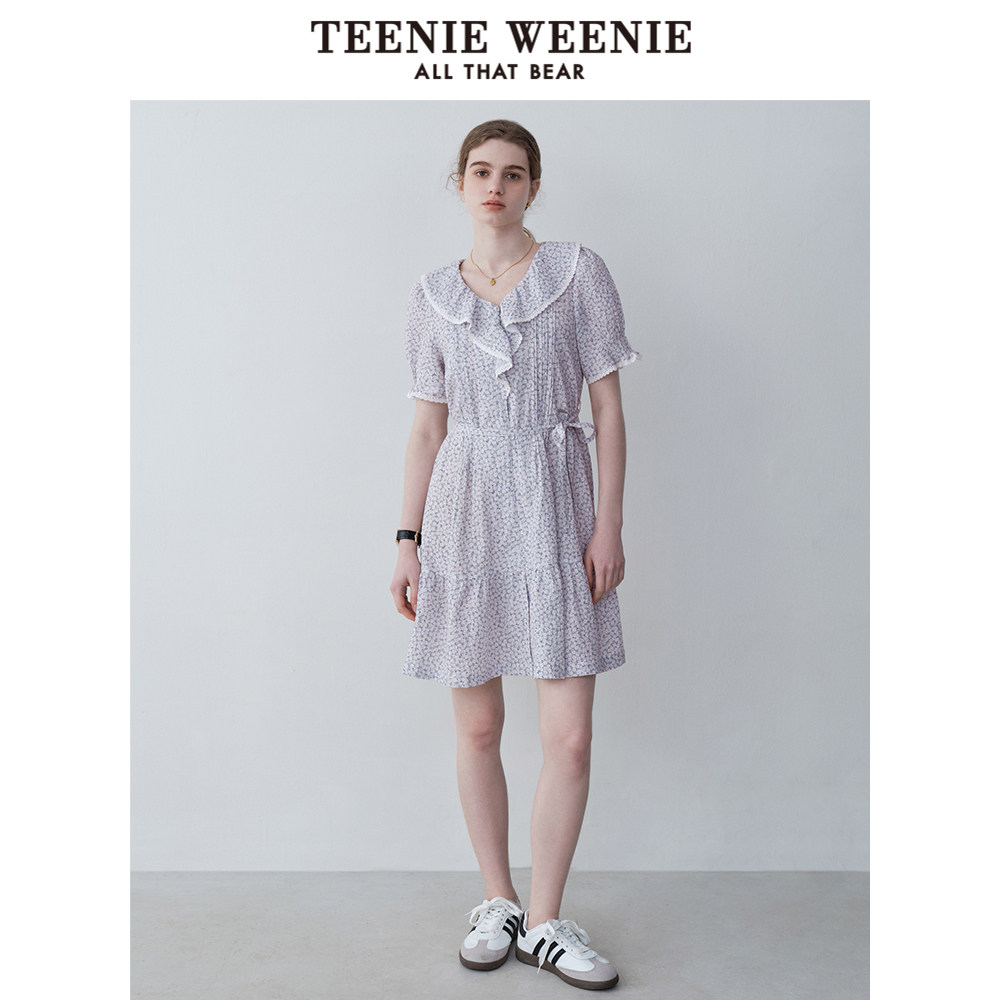 TeenieWeenie小熊奥莱荷叶边法式田园碎花连衣裙收腰茶歇裙紫色女