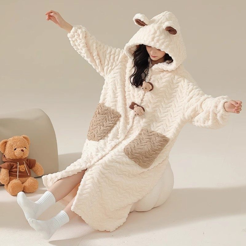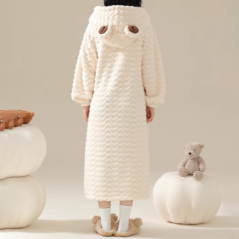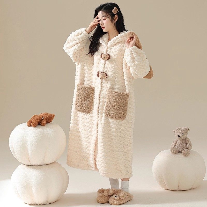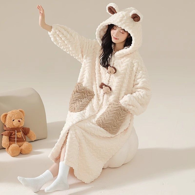睡袍女款秋冬季2025新款珊瑚绒小熊冬季加绒睡衣浴袍中长款家居服