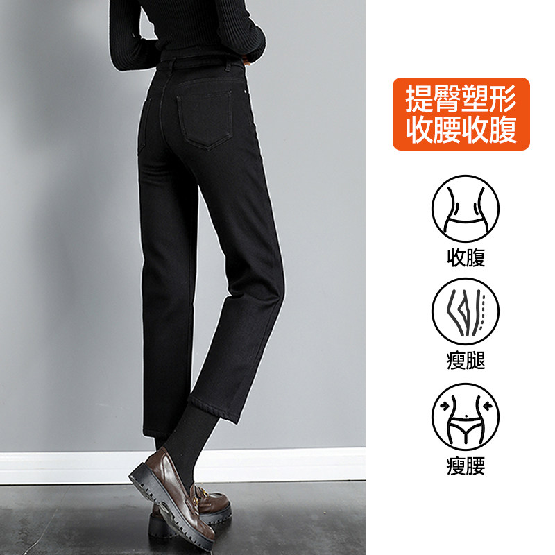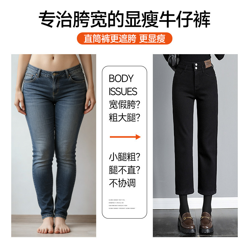 欧货加绒加厚牛仔裤女冬季新款大码胖mm梨形身材小个子直筒阔腿裤