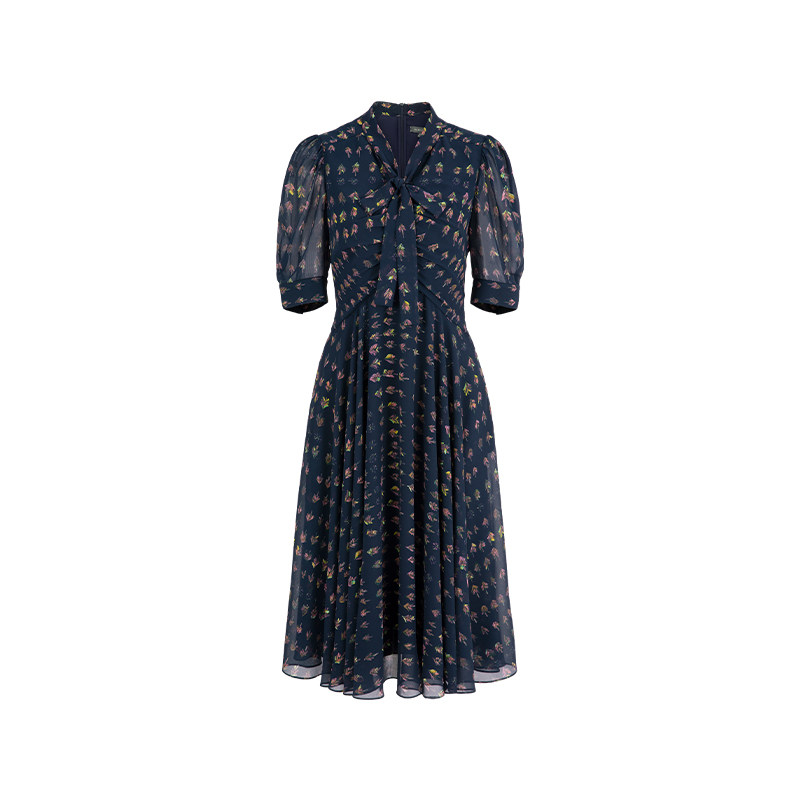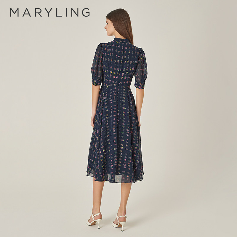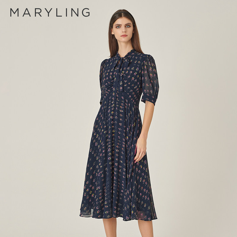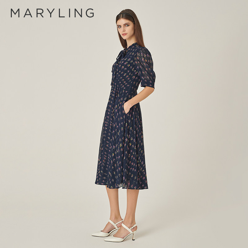 MARYLING玛俪琳秋季新品蓝色高级感中长裙中袖蝴蝶结印花连衣裙