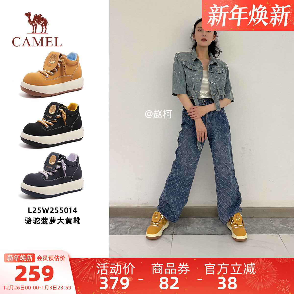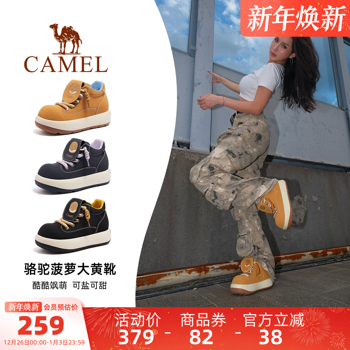 骆驼菠萝大黄靴女鞋2025秋季新款复古松糕厚底马丁靴女大头短靴子