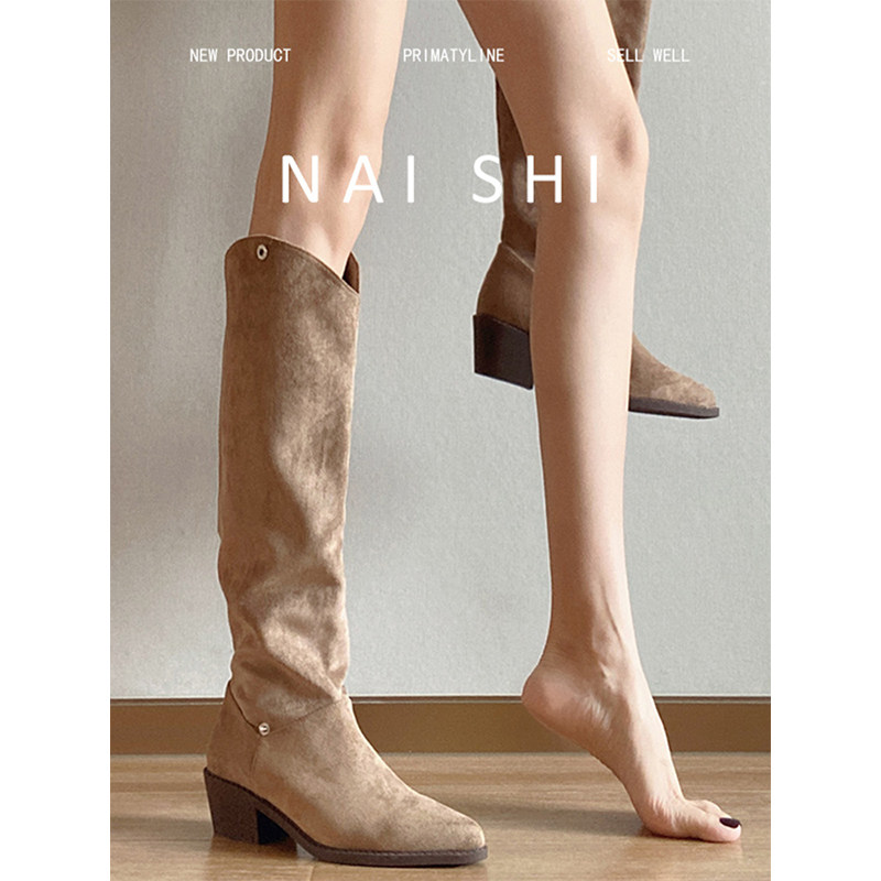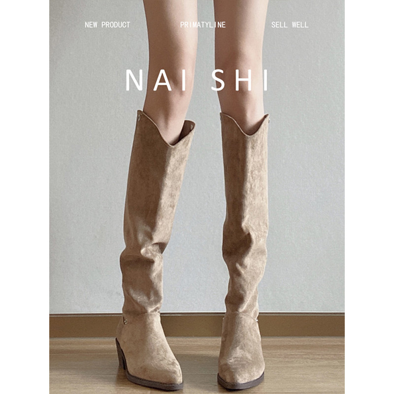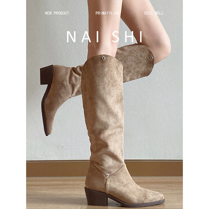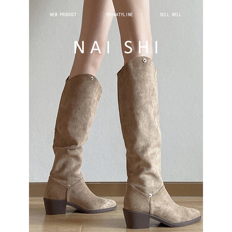 !牛仔靴女v口尖头瘦瘦靴长靴高筒骑士靴高跟卡其色羊皮黑色复古
