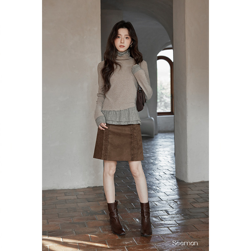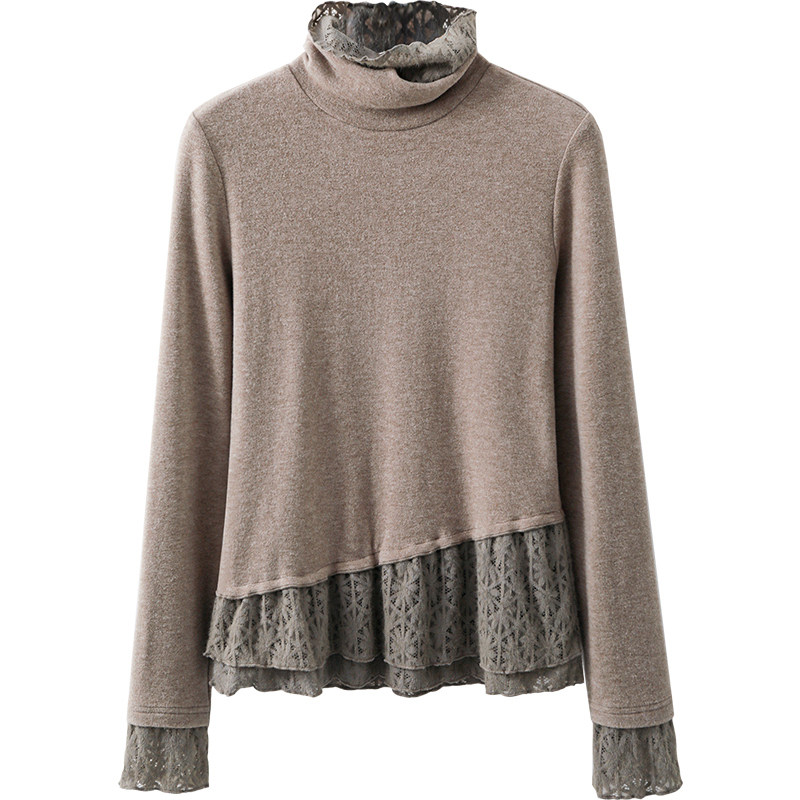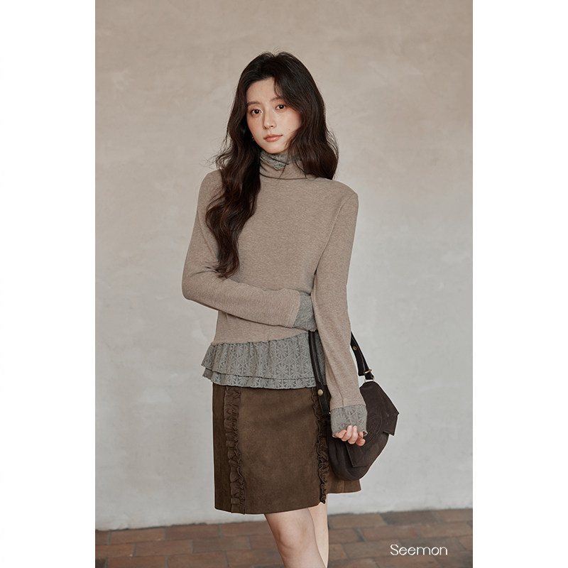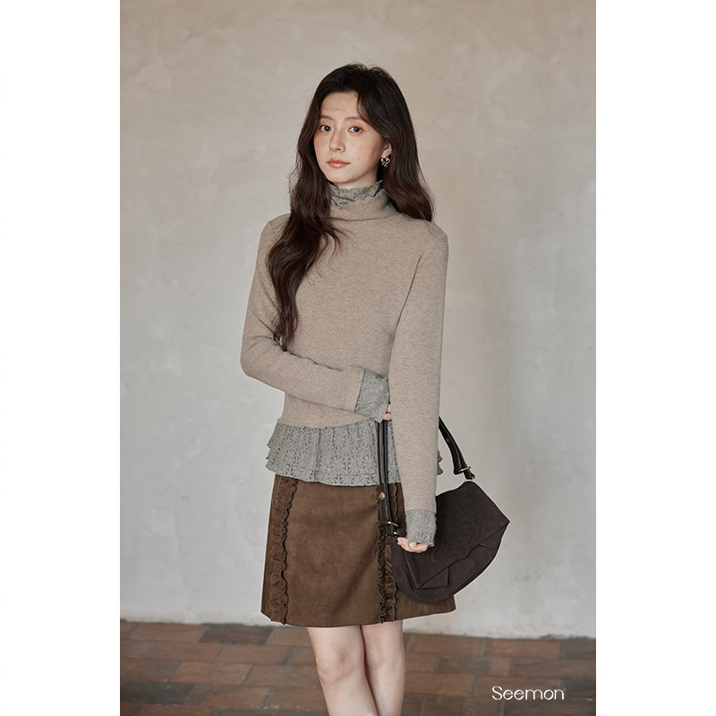 夕蒙2025新款冬季韩系气质上衣小个子小众蕾丝拼接假两件长袖t恤