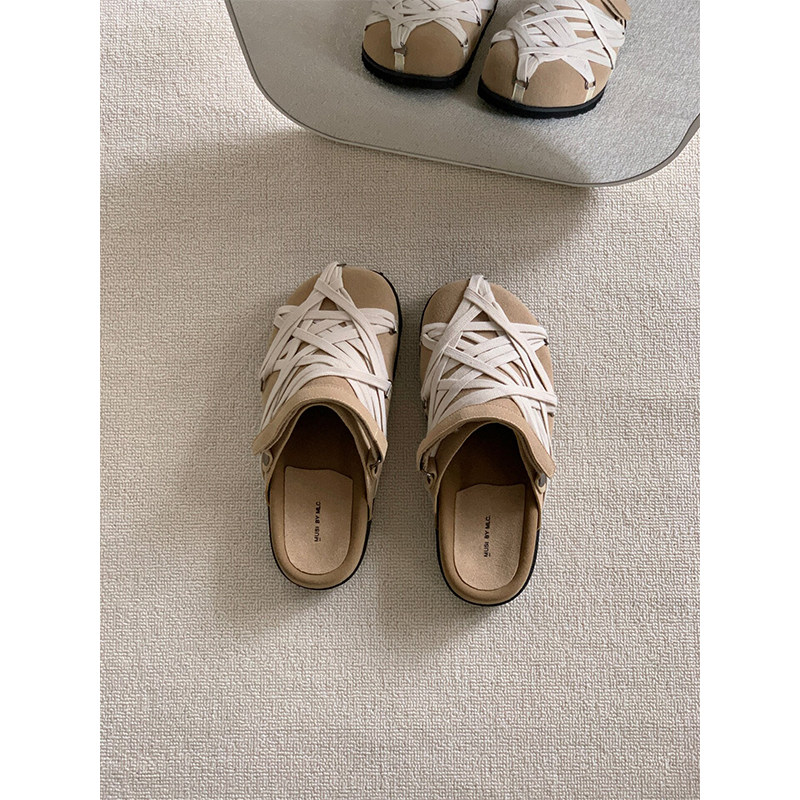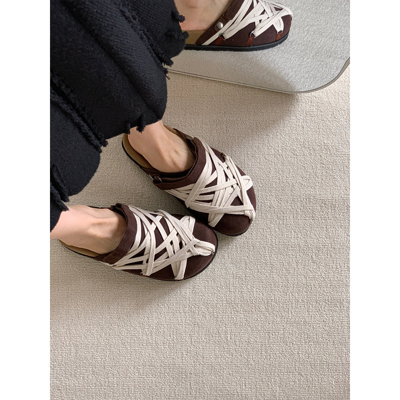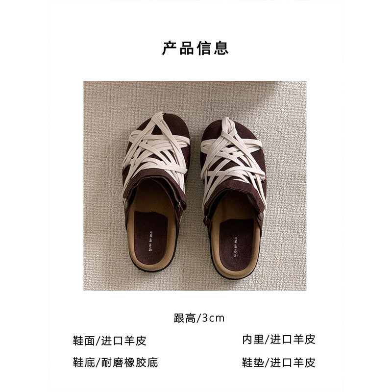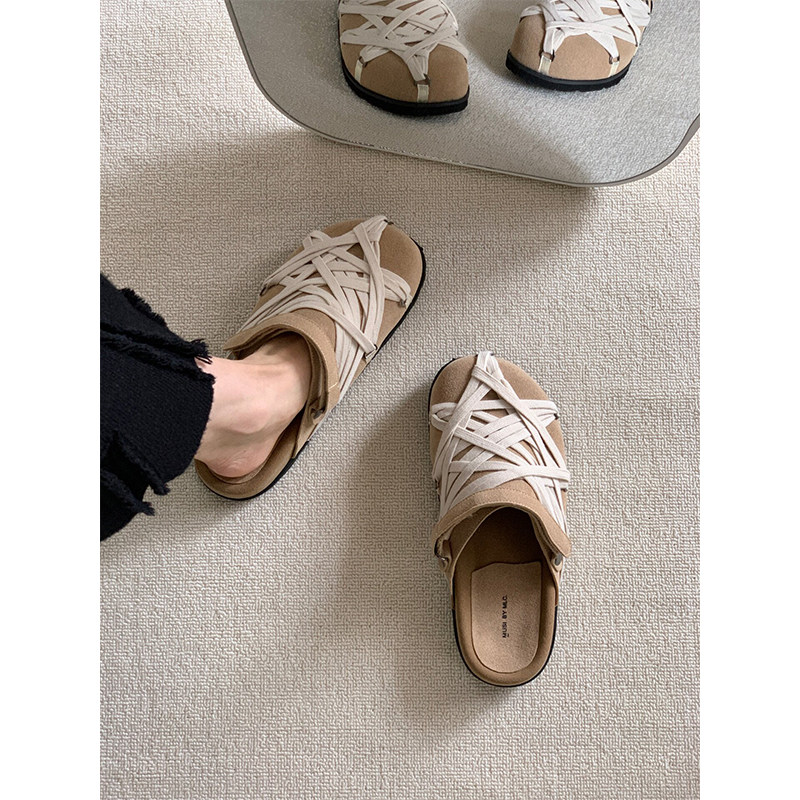 !日系绑带勃肯鞋女夏外穿休闲运动风一脚蹬包头半拖鞋魔术贴圆头