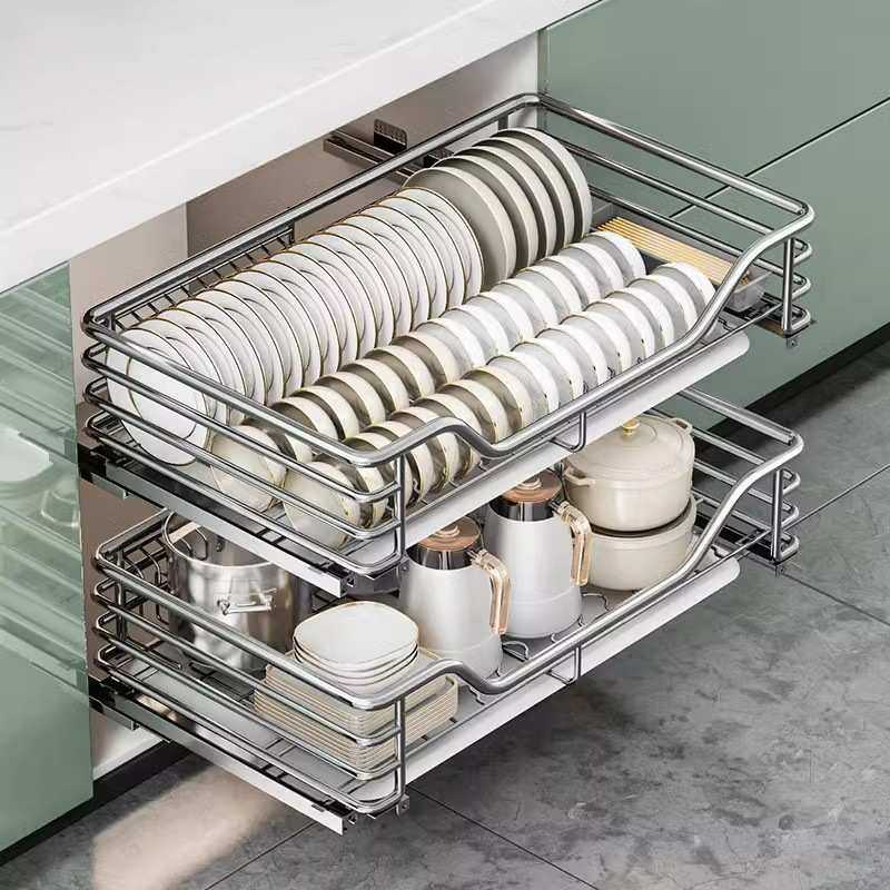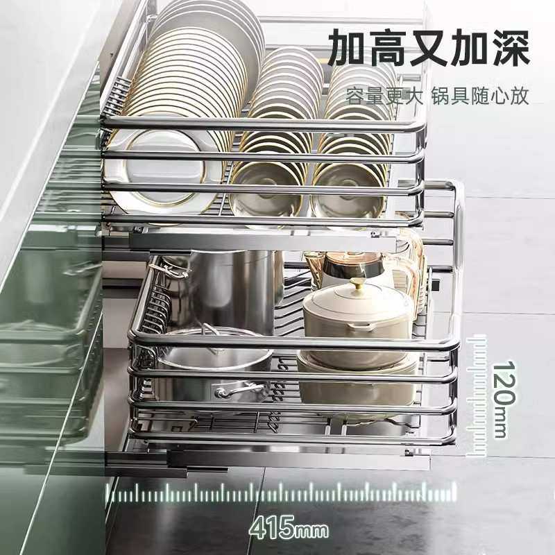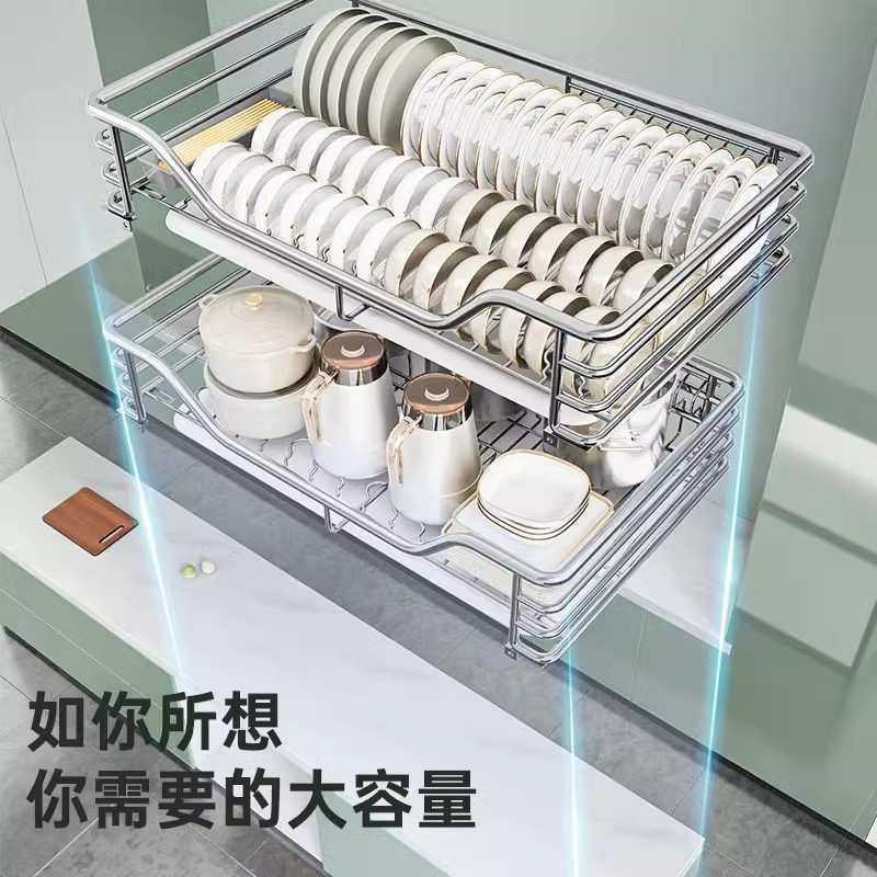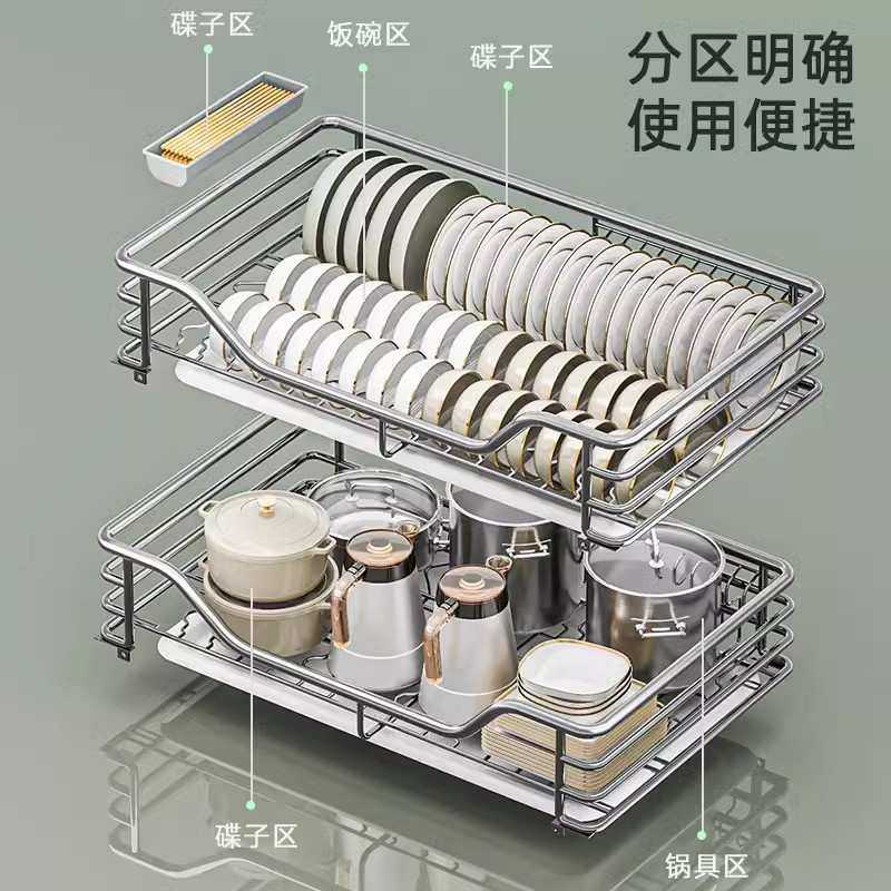 拉篮厨房橱柜304实心加厚不锈钢抽屉式碗架厨柜碗柜双层收纳碟架