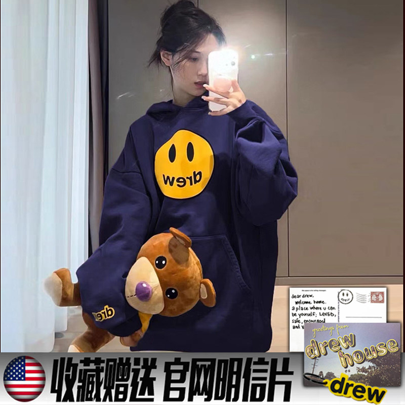 Drew笑脸卫衣美式宽松女秋冬季薄款纯棉情侣装加绒红色连帽外套男
