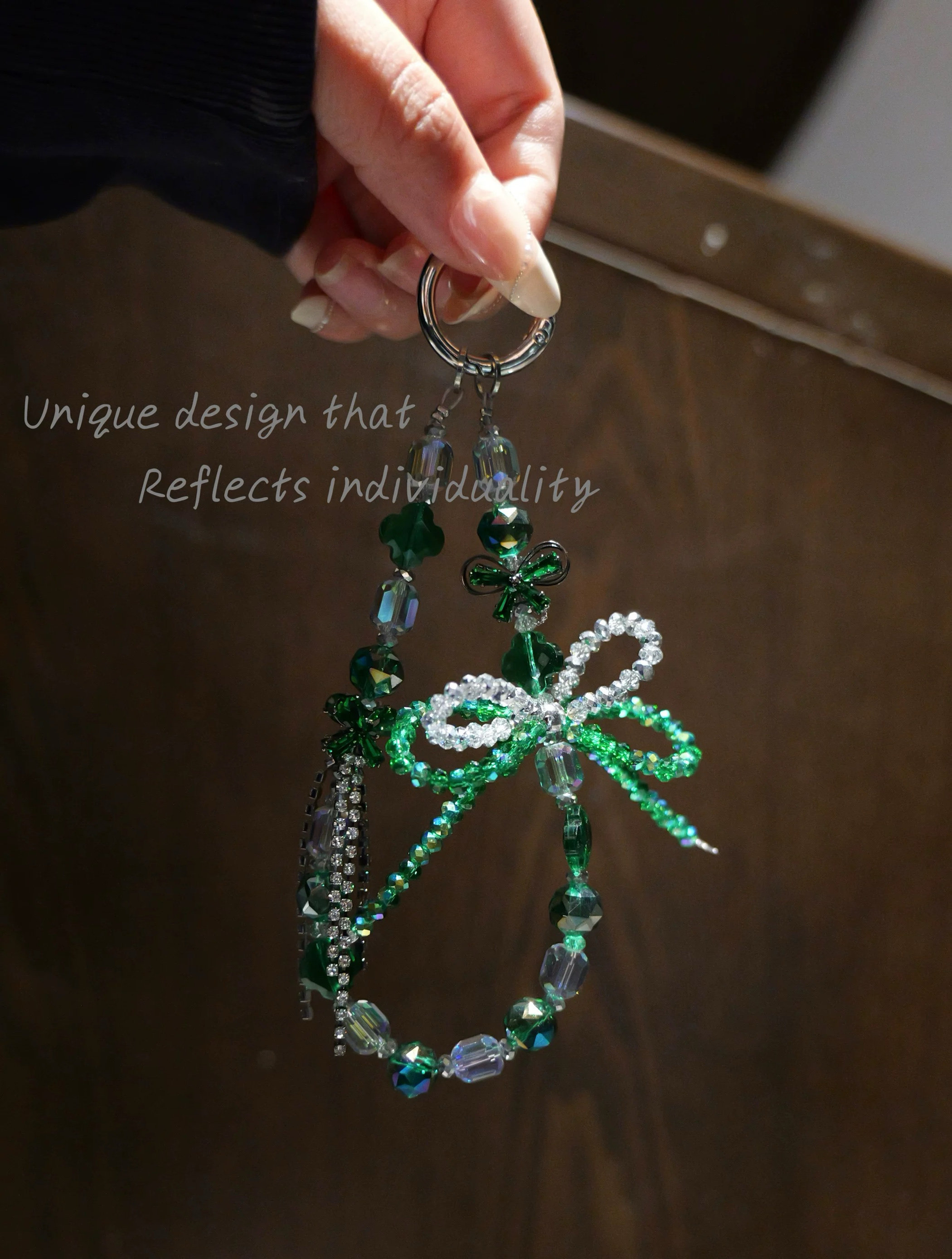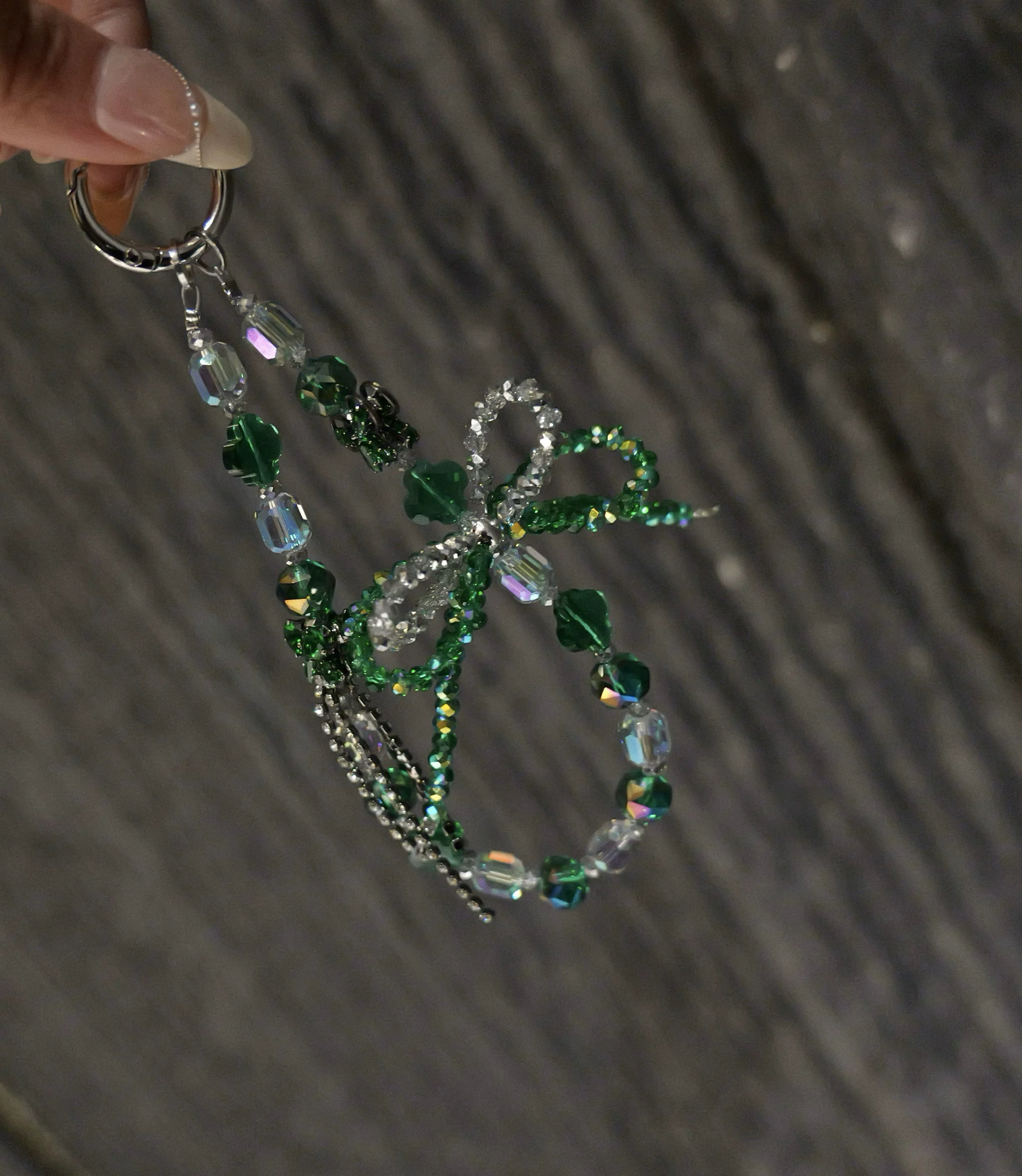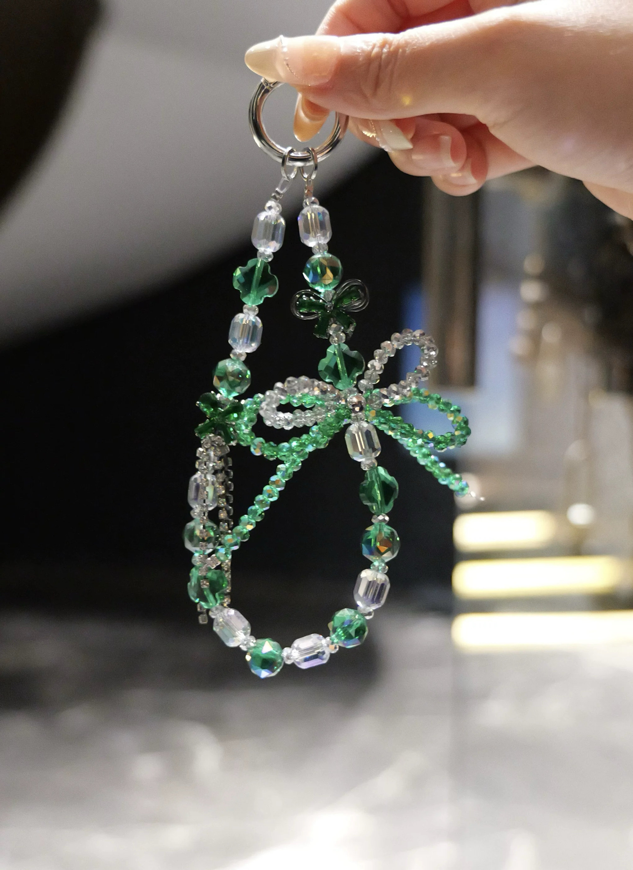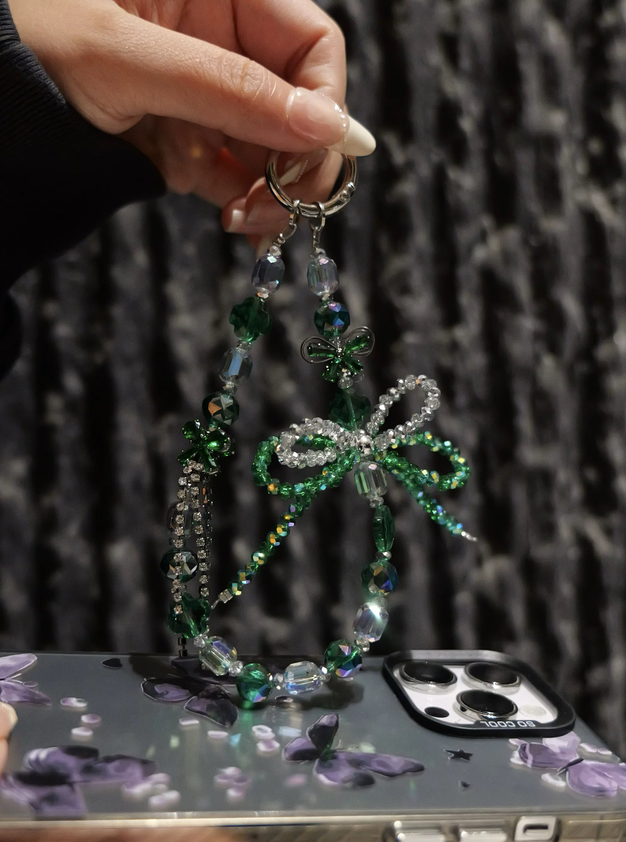 原创高级奢华祖母绿水晶蝴蝶结锆石手机链串珠手腕短链钥匙扣挂件