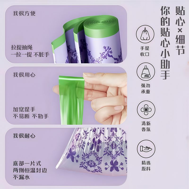 e洁垃圾袋家用手提式抽绳加厚加大家用宿舍抽绳免撕紫色塑料袋