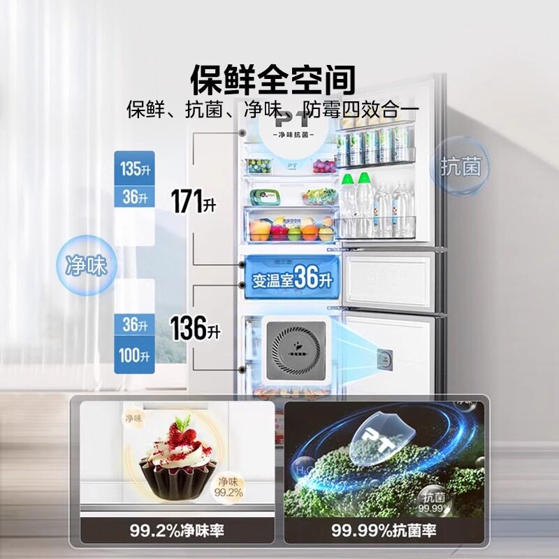美的283三开门风冷无霜家用小型租房宿舍用变频一级电冰箱大容量