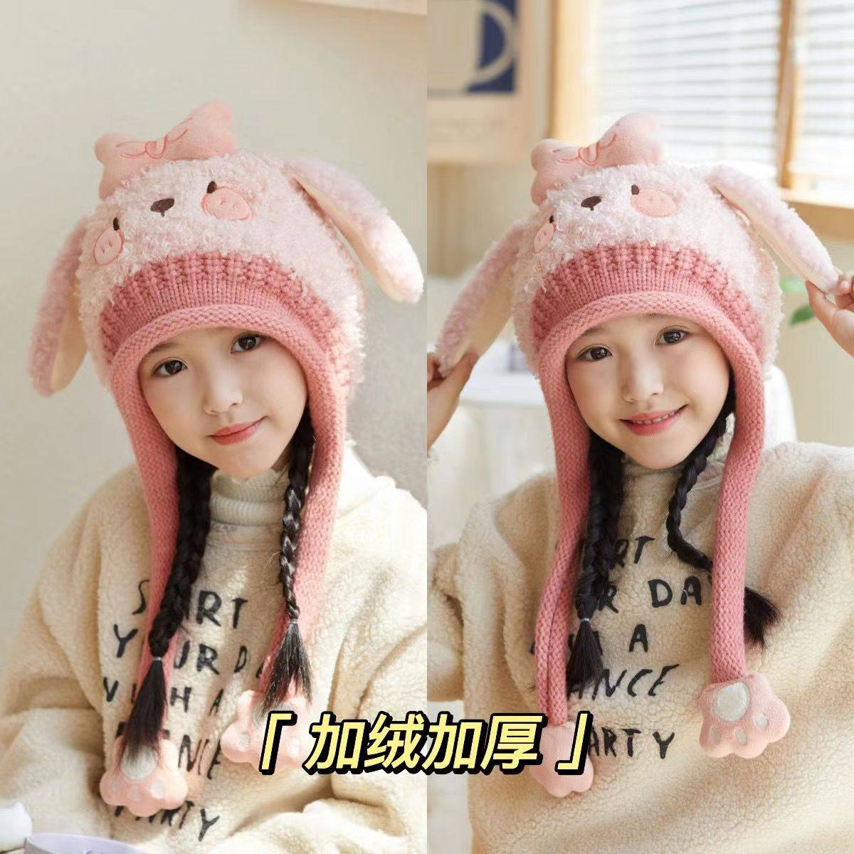 儿童帽子2024秋冬新款宝宝毛绒帽子围巾一体保暖护耳帽女童针织帽