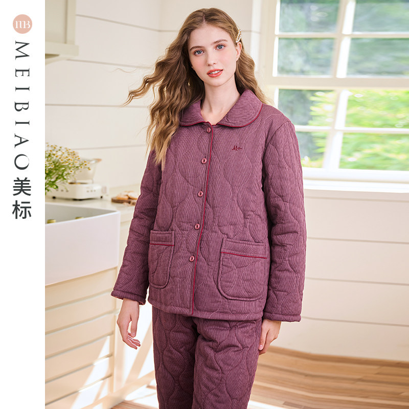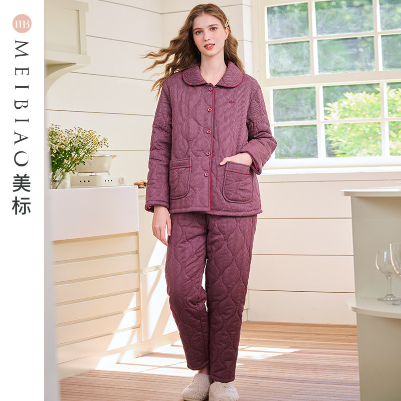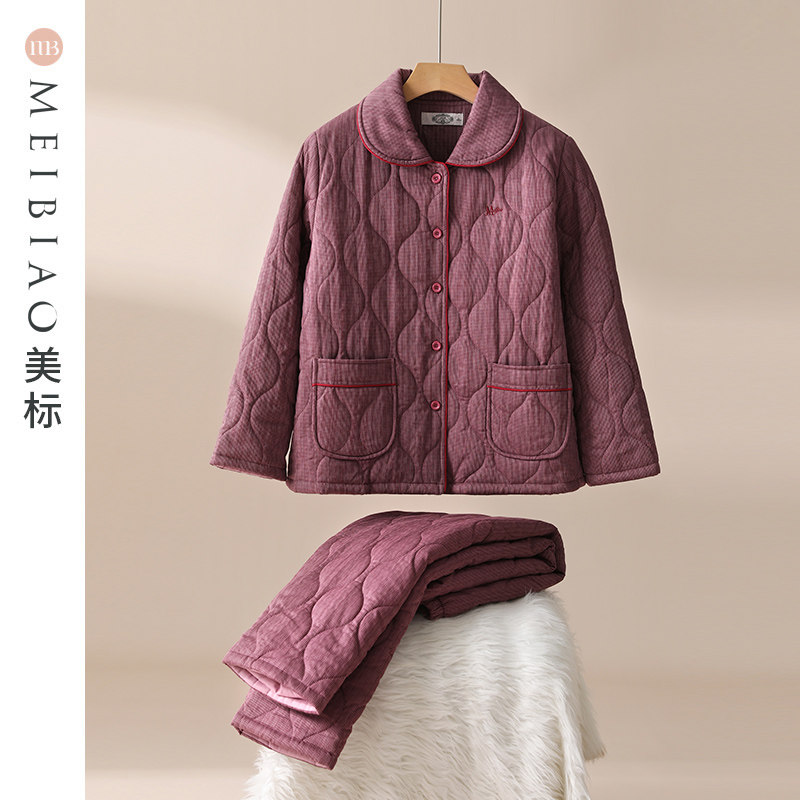 美标三层加厚夹棉睡衣套装女秋冬季休闲格子纯棉全棉可外穿家居服