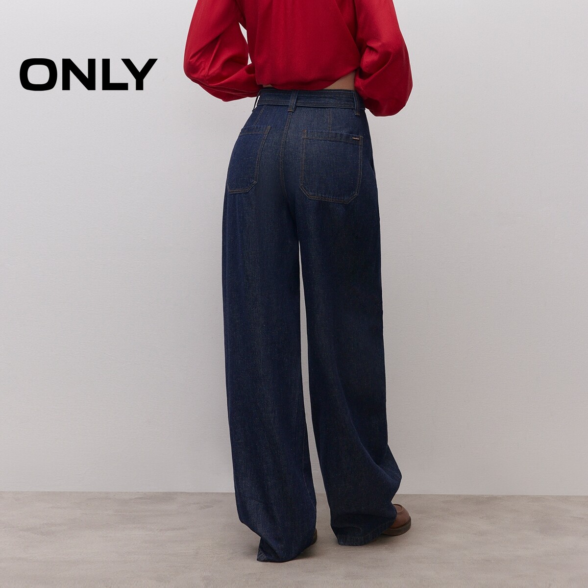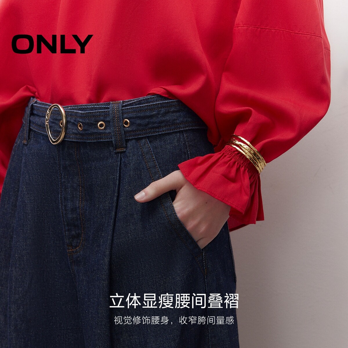 ONLY春季潮流牛仔腰带裤腰叠褶高腰宽松裤子阔腿裤牛仔裤女
