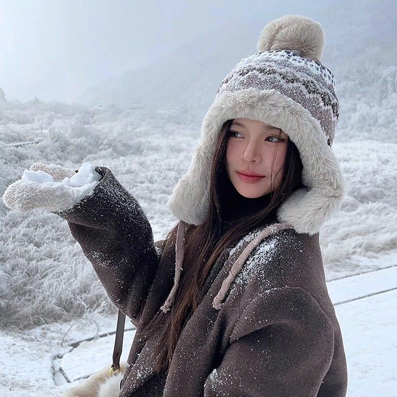 加厚加绒保暖雷锋帽子女秋冬季针织费尔岛护耳帽东北防寒红色黑色