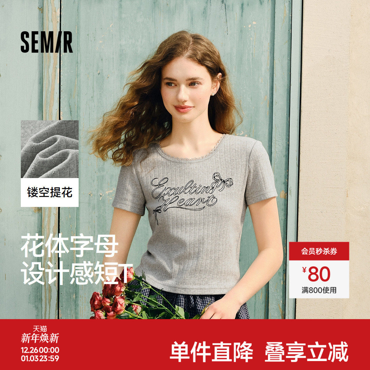 森马短袖T恤女短款字母花边修身正肩2025夏新款镂空提花上衣甜美