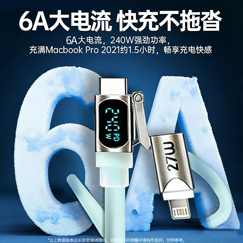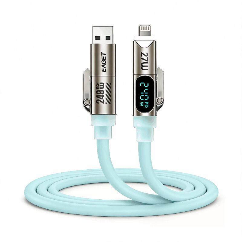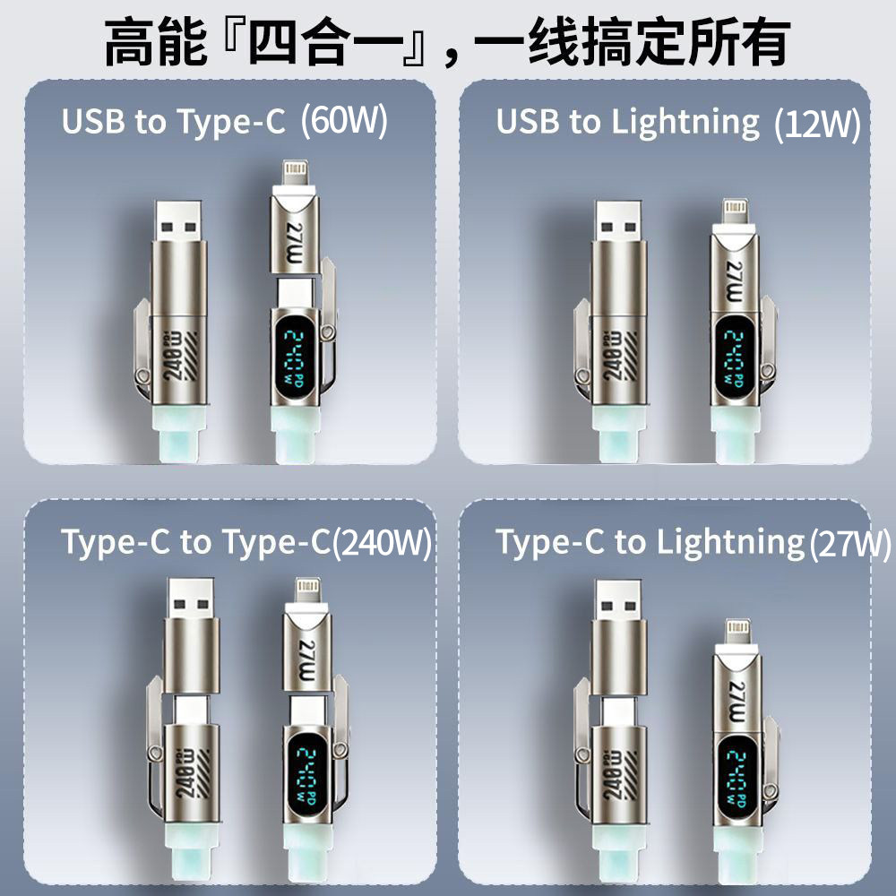 忆捷240W四合一液态硅胶呼吸灯智能数显数据线适用安卓苹果快充线支持手机平板笔记本