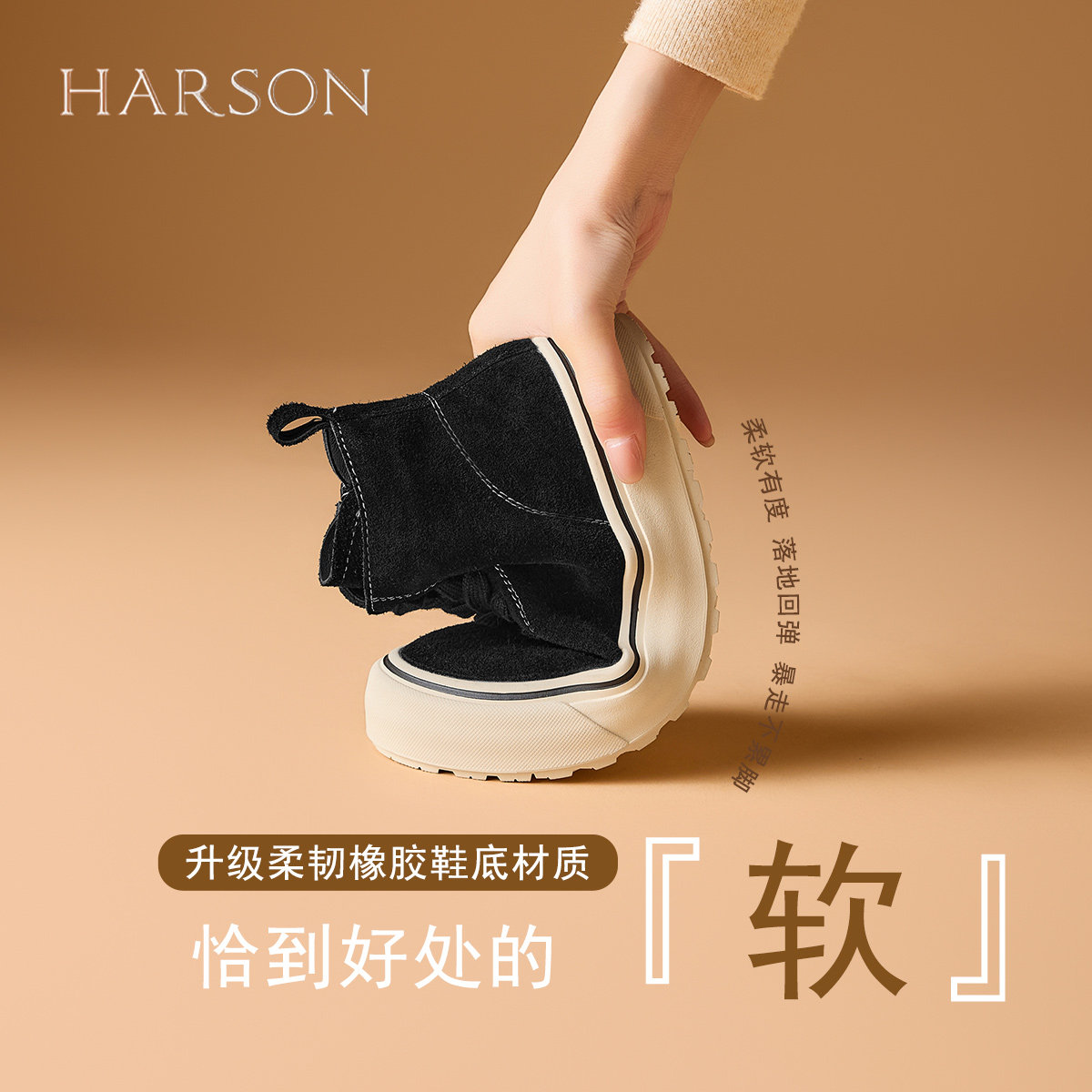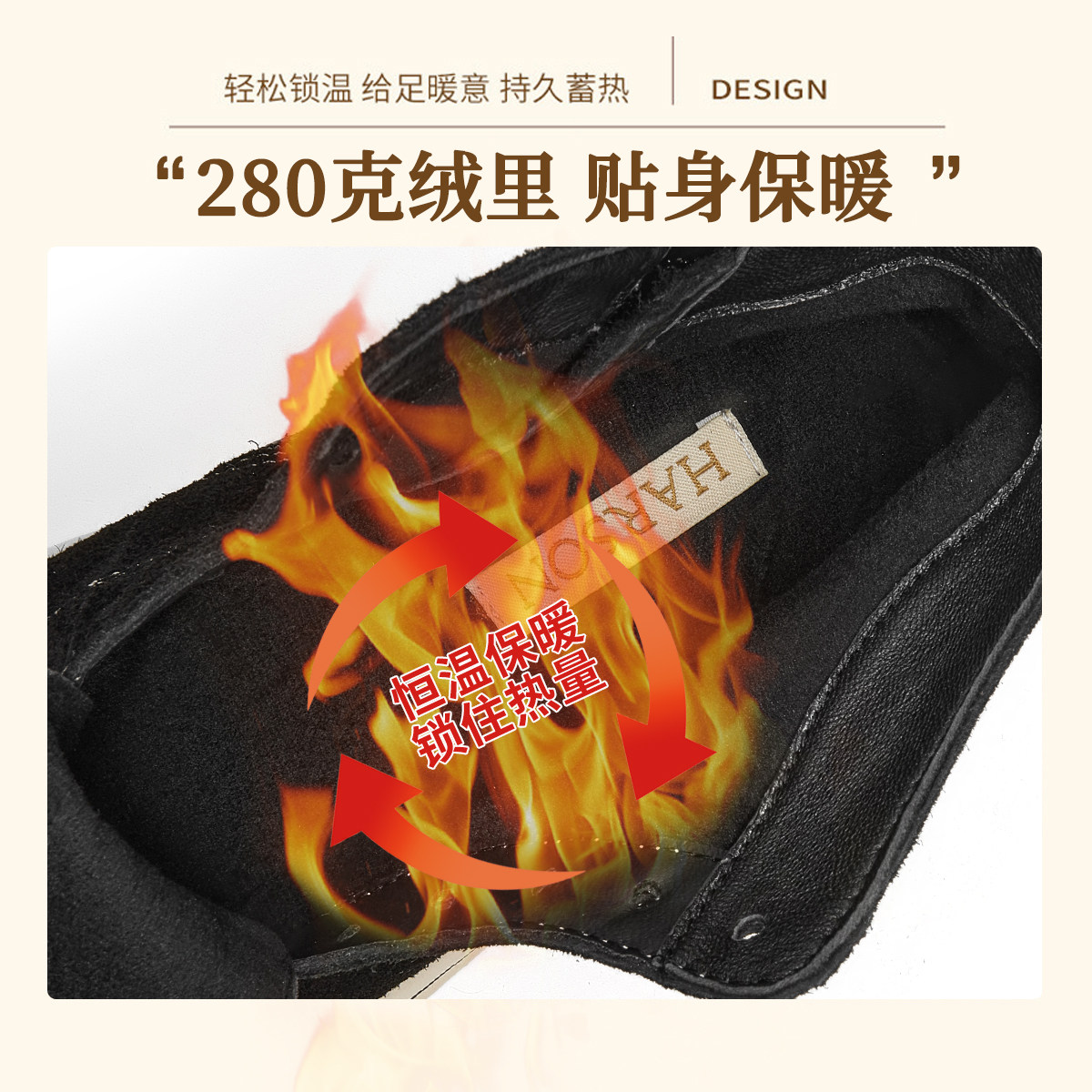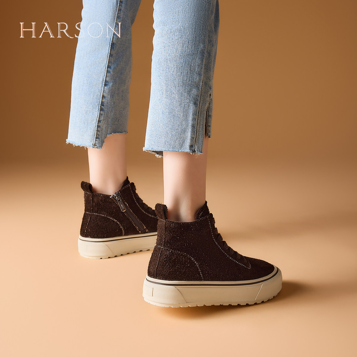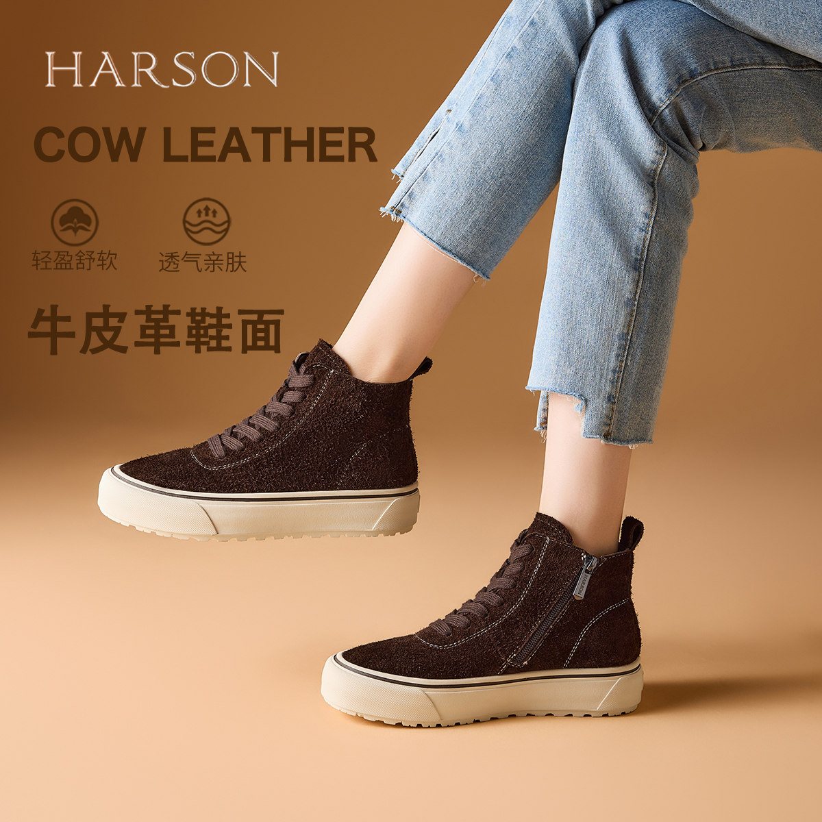 哈森头层牛皮加绒保暖高帮休闲鞋女鞋25冬季新款运动百搭板鞋子